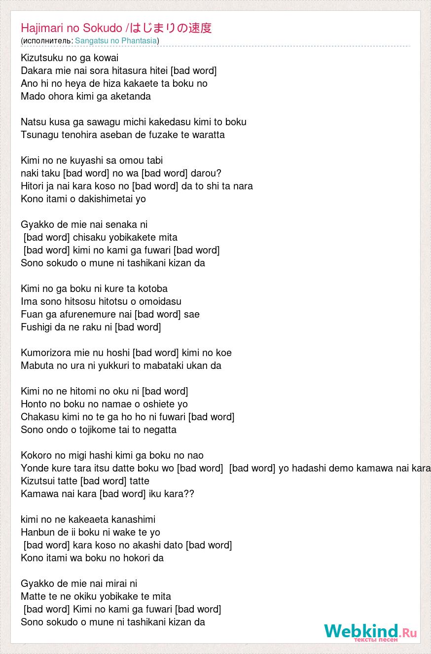 Kizutsuku no ga kowai Dakara mie nai sora hitasura hitei [bad word] Ano hi no heya de hiza kakaete ta boku no Mado ohora kimi ga aketanda Natsu kusa ga sawagu michi kakedasu kimi to boku Tsunagu tenohira aseban de fuzake te waratta Kimi no ne kuyashi sa omou tabi naki taku [bad word] no wa [bad word] darou? Hitori ja nai kara koso no [bad word] da to shi ta nara Kono itami o dakishimetai yo Gyakko de mie nai senaka ni [bad word] chisaku yobikakete mita [bad word] kimi no kami ga fuwari [bad word] Sono sokudo o mune ni tashikani kizan da Kimi no ga boku ni kure ta kotoba Ima sono hitsosu hitotsu o omoidasu Fuan ga afurenemure nai [bad word] sae Fushigi da ne raku ni [bad word] Kumorizora mie nu hoshi [bad word] kimi no koe Mabuta no ura ni yukkuri to mabataki ukan da Kimi no ne hitomi no oku ni [bad word] Honto no boku no namae o oshiete yo Chakasu kimi no te ga ho ho ni fuwari [bad word] Sono ondo o tojikome tai to negatta Kokoro no migi hashi kimi ga boku no nao Yonde kure tara itsu datte boku wo [bad word] [bad word] yo hadashi demo kamawa nai kara Kizutsui tatte [bad word] tatte Kamawa nai kara [bad word] iku kara?? kimi no ne kakeaeta kanashimi Hanbun de ii boku ni wake te yo [bad word] kara koso no akashi dato [bad word] Kono itami wa boku no hokori da Gyakko de mie nai mirai ni Matte te ne okiku yobikake te mita [bad word] Kimi no kami ga fuwari [bad word] Sono sokudo o mune ni tashikani kizan da