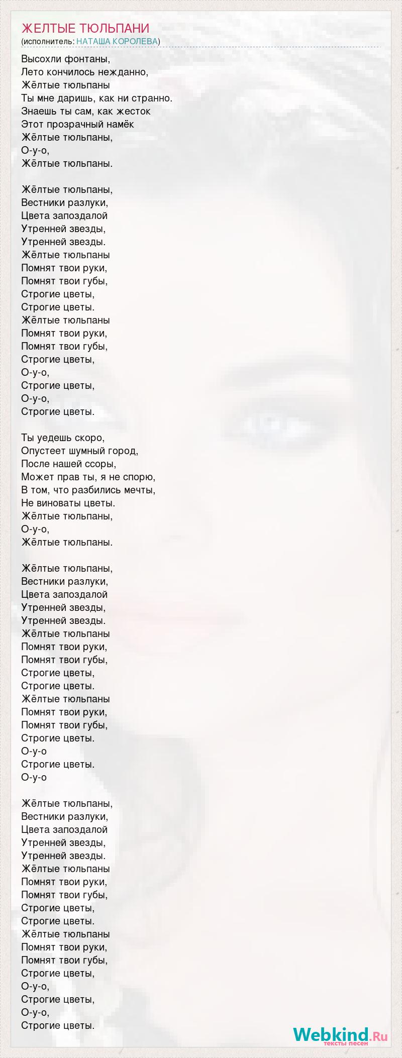 Высохли фонтаны, Лето кончилось нежданно, Жёлтые тюльпаны Ты мне даришь, как ни странно. Знаешь ты сам, как жесток Этот прозрачный намёк Жёлтые тюльпаны, О-у-о, Жёлтые тюльпаны. Жёлтые тюльпаны, Вестники разлуки, Цвета запоздалой Утренней звезды, Утренней звезды. Жёлтые тюльпаны Помнят твои руки, Помнят твои губы, Строгие цветы, Строгие цветы. Жёлтые тюльпаны Помнят твои руки, Помнят твои губы, Строгие цветы, О-у-о, Строгие цветы, О-у-о, Строгие цветы. Ты уедешь скоро, Опустеет шумный город, После нашей ссоры, Может прав ты, я не спорю, В том, что разбились мечты, Не виноваты цветы. Жёлтые тюльпаны, О-у-о, Жёлтые тюльпаны. Жёлтые тюльпаны, Вестники разлуки, Цвета запоздалой Утренней звезды, Утренней звезды. Жёлтые тюльпаны Помнят твои руки, Помнят твои губы, Строгие цветы, Строгие цветы. Жёлтые тюльпаны Помнят твои руки, Помнят твои губы, Строгие цветы. О-у-о Строгие цветы. О-у-о Жёлтые тюльпаны, Вестники разлуки, Цвета запоздалой Утренней звезды, Утренней звезды. Жёлтые тюльпаны Помнят твои руки, Помнят твои губы, Строгие цветы, Строгие цветы. Жёлтые тюльпаны Помнят твои руки, Помнят твои губы, Строгие цветы, О-у-о, Строгие цветы, О-у-о, Строгие цветы.