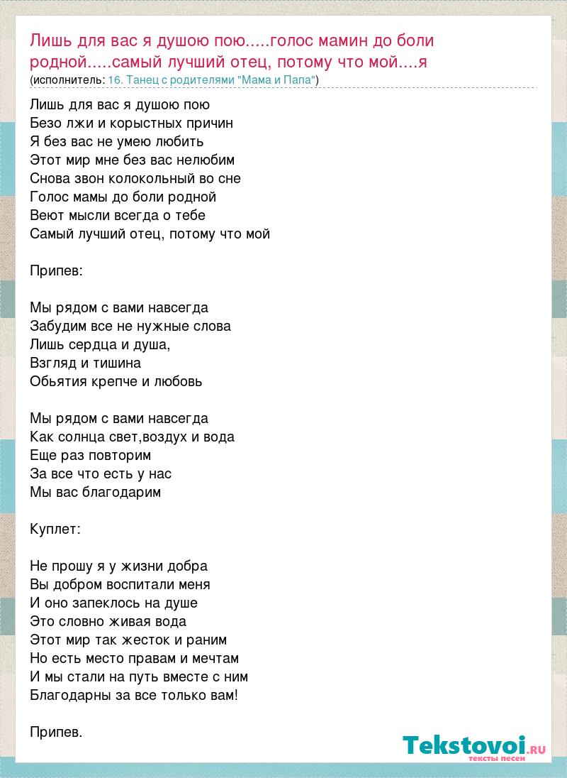 Лишь для вас я душою пою Безо лжи и корыстных причин Я без вас не умею любить Этот мир мне без вас нелюбим Снова звон колокольный во сне Голос мамы до боли родной Веют мысли всегда о тебе Самый лучший отец, потому что мой Припев: Мы рядом с вами навсегда Забудим все не нужные слова Лишь сердца и душа, Взгляд и тишина Обьятия крепче и любовь Мы рядом с вами навсегда Как солнца свет,воздух и вода Еще раз повторим За все что есть у нас Мы вас благодарим Куплет: Не прошу я у жизни добра Вы добром воспитали меня И оно запеклось на душе Это словно живая вода Этот мир так жесток и раним Но есть место правам и мечтам И мы стали на путь вместе с ним Благодарны за все только вам! Припев.