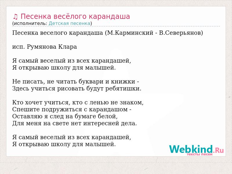 Песенка веселого карандаша (М.Карминский - В.Северьянов) исп. Румянова Клара Я самый веселый из всех карандашей, Я открываю школу для малышей. Не писать, не читать буквари и книжки - Здесь учиться рисовать будут ребятишки. Кто хочет учиться, кто с ленью не знаком, Спешите подружиться с карандашом - Оставляю я след на бумаге белой, Для меня на свете нет интересней дела. Я самый веселый из всех карандашей, Я открываю школу для малышей.