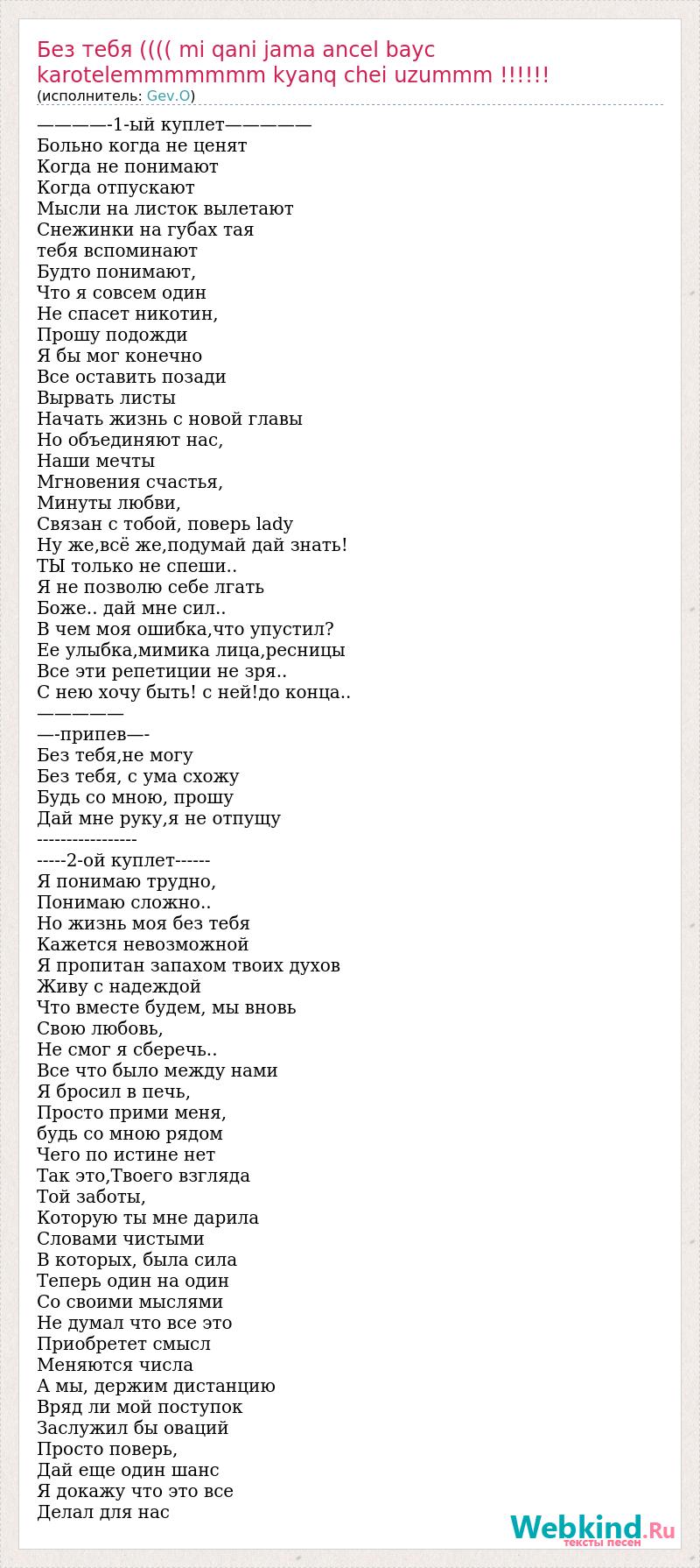 ————-1-ый куплет————— Больно когда не ценят Когда не понимают Когда отпускают Мысли на листок вылетают Снежинки на губах тая тебя вспоминают Будто понимают, Что я совсем один Не спасет никотин, Прошу подожди Я бы мог конечно Все оставить позади Вырвать листы Начать жизнь с новой главы Но объединяют нас, Наши мечты Мгновения счастья, Минуты любви, Связан с тобой, поверь lady Ну же,всё же,подумай дай знать! ТЫ только не спеши.. Я не позволю себе лгать Боже.. дай мне сил.. В чем моя ошибка,что упустил? Ее улыбка,мимика лица,ресницы Все эти репетиции не зря.. С нею хочу быть! с ней!до конца.. ————— —-припев—- Без тебя,не могу Без тебя, с ума схожу Будь со мною, прошу Дай мне руку,я не отпущу ----------------- -----2-ой куплет------ Я понимаю трудно, Понимаю сложно.. Но жизнь моя без тебя Кажется невозможной Я пропитан запахом твоих духов Живу с надеждой Что вместе будем, мы вновь Свою любовь, Не смог я сберечь.. Все что было между нами Я бросил в печь, Просто прими меня, будь со мною рядом Чего по истине нет Так это,Твоего взгляда Той заботы, Которую ты мне дарила Словами чистыми В которых, была сила Теперь один на один Со своими мыслями Не думал что все это Приобретет смысл Меняются числа А мы, держим дистанцию Вряд ли мой поступок Заслужил бы оваций Просто поверь, Дай еще один шанс Я докажу что это все Делал для нас