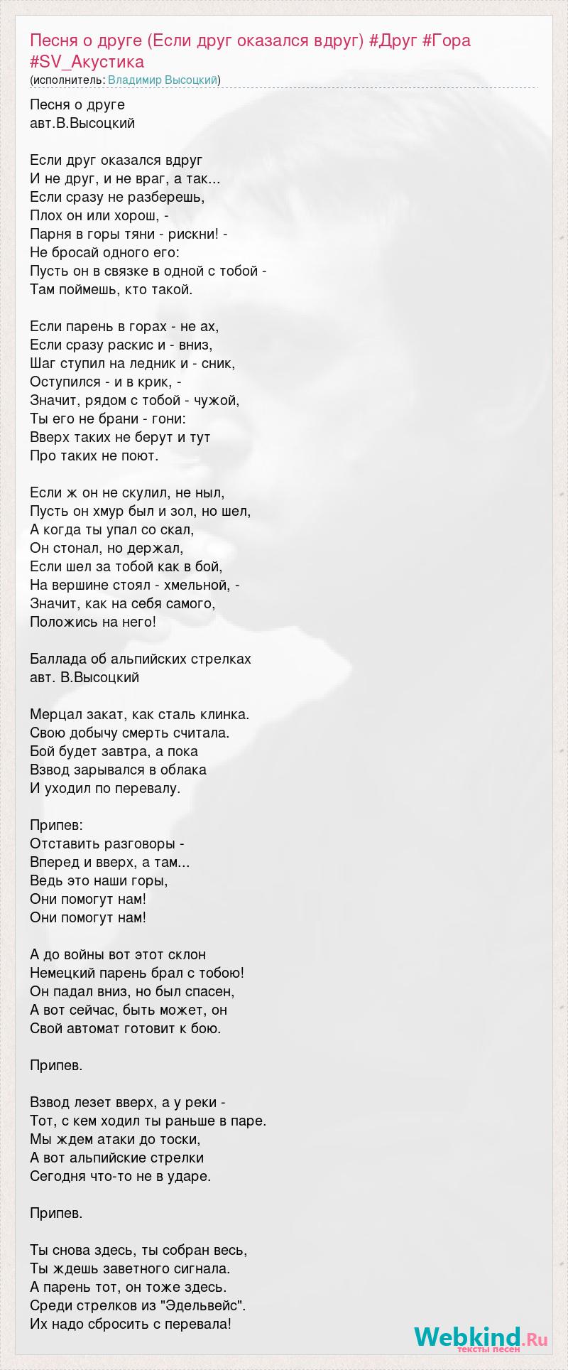 Песня о друге авт.В.Высоцкий Если друг оказался вдруг И не друг, и не враг, а так... Если сразу не разберешь, Плох он или хорош, - Парня в горы тяни - рискни! - Не бросай одного его: Пусть он в связке в одной с тобой - Там поймешь, кто такой. Если парень в горах - не ах, Если сразу раскис и - вниз, Шаг ступил на ледник и - сник, Оступился - и в крик, - Значит, рядом с тобой - чужой, Ты его не брани - гони: Вверх таких не берут и тут Про таких не поют. Если ж он не скулил, не ныл, Пусть он хмур был и зол, но шел, А когда ты упал со скал, Он стонал, но держал, Если шел за тобой как в бой, На вершине стоял - хмельной, - Значит, как на себя самого, Положись на него! Баллада об альпийских стрелках авт. В.Высоцкий Мерцал закат, как сталь клинка. Свою добычу смерть считала. Бой будет завтра, а пока Взвод зарывался в облака И уходил по перевалу. Припев: Отставить разговоры - Вперед и вверх, а там... Ведь это наши горы, Они помогут нам! Они помогут нам! А до войны вот этот склон Немецкий парень брал с тобою! Он падал вниз, но был спасен, А вот сейчас, быть может, он Свой автомат готовит к бою. Припев. Взвод лезет вверх, а у реки - Тот, с кем ходил ты раньше в паре. Мы ждем атаки до тоски, А вот альпийские стрелки Сегодня что-то не в ударе. Припев. Ты снова здесь, ты собран весь, Ты ждешь заветного сигнала. А парень тот, он тоже здесь. Среди стрелков из "Эдельвейс". Их надо сбросить с перевала!
