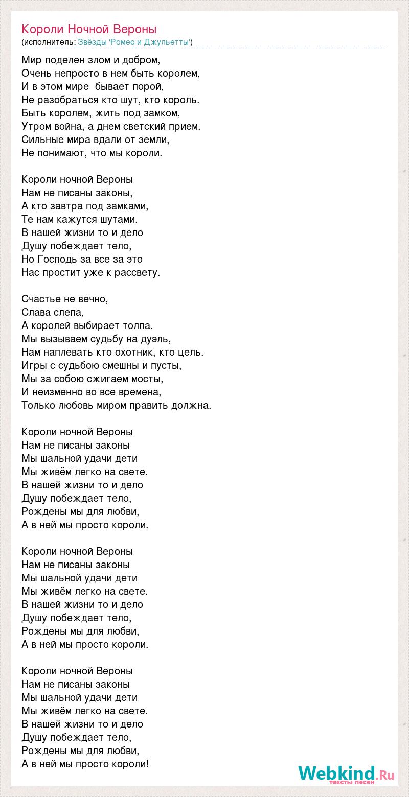 Мир поделен злом и добром, Очень непросто в нем быть королем, И в этом мире бывает порой, Не разобраться кто шут, кто король. Быть королем, жить под замком, Утром война, а днем светский прием. Сильные мира вдали от земли, Не понимают, что мы короли. Короли ночной Вероны Нам не писаны законы, А кто завтра под замками, Те нам кажутся шутами. В нашей жизни то и дело Душу побеждает тело, Но Господь за все за это Нас простит уже к рассвету. Счастье не вечно, Слава слепа, А королей выбирает толпа. Мы вызываем судьбу на дуэль, Нам наплевать кто охотник, кто цель. Игры с судьбою смешны и пусты, Мы за собою сжигаем мосты, И неизменно во все времена, Только любовь миром править должна. Короли ночной Вероны Нам не писаны законы Мы шальной удачи дети Мы живём легко на свете. В нашей жизни то и дело Душу побеждает тело, Рождены мы для любви, А в ней мы просто короли. Короли ночной Вероны Нам не писаны законы Мы шальной удачи дети Мы живём легко на свете. В нашей жизни то и дело Душу побеждает тело, Рождены мы для любви, А в ней мы просто короли. Короли ночной Вероны Нам не писаны законы Мы шальной удачи дети Мы живём легко на свете. В нашей жизни то и дело Душу побеждает тело, Рождены мы для любви, А в ней мы просто короли!