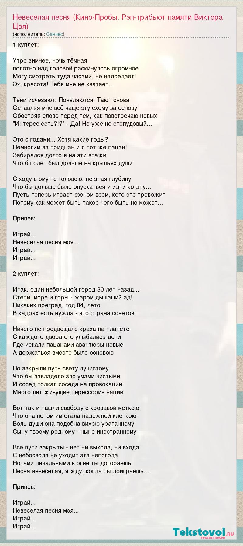 1 куплет: Утро зимнее, ночь тёмная полотно над головой раскинулось огромное Могу смотреть туда часами, не надоедает! Эх, красота! Тебя мне не хватает... Тени исчезают. Появляются. Тают снова Оставляя мне всё чаще эту схему за основу Обостряя слово перед тем, как повстречаю новых "Интерес есть?!?" - Да! Но уже не стопудовый... Это с годами... Хотя какие годы? Немногим за тридцан и я тот же пацан! Забирался долго я на эти этажи Что б полёт был дольше на крыльях души С ходу в омут с головою, не зная глубину Что бы дольше было опускаться и идти ко дну... Пусть теперь играет фоном всем, кого это тревожит Потому как может быть такое чего быть не может... Припев: Играй... Невеселая песня моя... Играй... Играй... 2 куплет: Итак, один небольшой город 30 лет назад... Степи, море и горы - жаром дышащий ад! Никаких преград, год 84, лето В кадрах есть нужда - это страна советов Ничего не предвещало краха на планете С каждого двора его улыбались дети Где искали пацанами авантюры новые А держаться вместе было основою Но закрыли путь свету лучистому Что бы завладело зло умами чистыми И сосед толкал соседа на провокации Много лет живущие перессорив нации Вот так и нашли свободу с кровавой меткою Что она потом им стала надежной клеткою Боль души она подобна вихрю ураганному Сыну твоему родному - ныне иностранному Все пути закрыты - нет ни выхода, ни входа С небосвода не уходит эта непогода Нотами печальными в огне ты догораешь Песня невеселая, я жду, когда ты доиграешь... Припев: Играй... Невеселая песня моя... Играй... Играй...