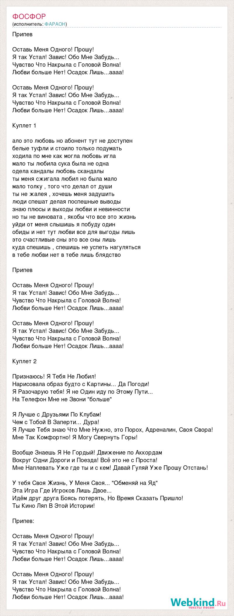 Припев Оставь Меня Одного! Прошу! Я так Устал! Завис! Обо Мне Забудь... Чувство Что Накрыла с Головой Волна! Любви больше Нет! Осадок Лишь...аааа! Оставь Меня Одного! Прошу! Я так Устал! Завис! Обо Мне Забудь... Чувство Что Накрыла с Головой Волна! Любви больше Нет! Осадок Лишь...аааа! Куплет 1 ало это любовь но абонент тут не доступен белые туфли и стоило только подумать ходила по мне как могла любовь игла мало ты любила сука была не одна одела кандалы любовь скандалы ты меня сжигала любил но была мало мало толку , того что делал от души ты не жалея , хочешь меня задушить люди спешат делая поспешные выводы знаю плюсы и выходы любви и невинности но ты не виновата , якобы что все это жизнь уйди от меня слышишь я побуду один обиды и нет тут любви все для выгоды лишь это счастливые сны это все сны лишь куда спешишь , спешишь не успеть нагуляться в тебе любви нет в тебе лишь блядство Припев Оставь Меня Одного! Прошу! Я так Устал! Завис! Обо Мне Забудь... Чувство Что Накрыла с Головой Волна! Любви больше Нет! Осадок Лишь...аааа! Оставь Меня Одного! Прошу! Я так Устал! Завис! Обо Мне Забудь... Чувство Что Накрыла с Головой Волна! Любви больше Нет! Осадок Лишь...аааа! Куплет 2 Признаюсь! Я Тебя Не Любил! Нарисовала образ будто с Картины... Да Погоди! Я Разочарую тебя! Я не Один иду по Этому Пути... На Телефон Мне не Звони "больше" Я Лучше с Друзьями По Клубам! Чем с Тобой В Заперти... Дура! Я Лучше Тебя знаю Что Мне Нужно, это Порох, Адреналин, Своя Свора! Мне Так Комфортно! Я Могу Свернуть Горы! Вообще Знаешь Я Не Гордый! Движение по Аккордам Вокруг Одни Дороги и Поезда! Всё это не с Проста! Мне Наплевать Уже где ты и с кем! Давай Гуляй Уже Прошу Отстань! У тебя Своя Жизнь, У Меня Своя... "Обменяй на Яд" Эта Игра Где Игроков Лишь Двое... Идём друг друга Боясь потерять, Но Время Сказать Пришло! Ты Кино Ляп В Этой Истории! Припев: Оставь Меня Одного! Прошу! Я так Устал! Завис! Обо Мне Забудь... Чувство Что Накрыла с Головой Волна! Любви больше Нет! Осадок Лишь...аааа! Оставь Меня Одного! Прошу! Я так Устал! Завис! Обо Мне Забудь... Чувство Что Накрыла с Головой Волна! Любви больше Нет! Осадок Лишь...аааа!