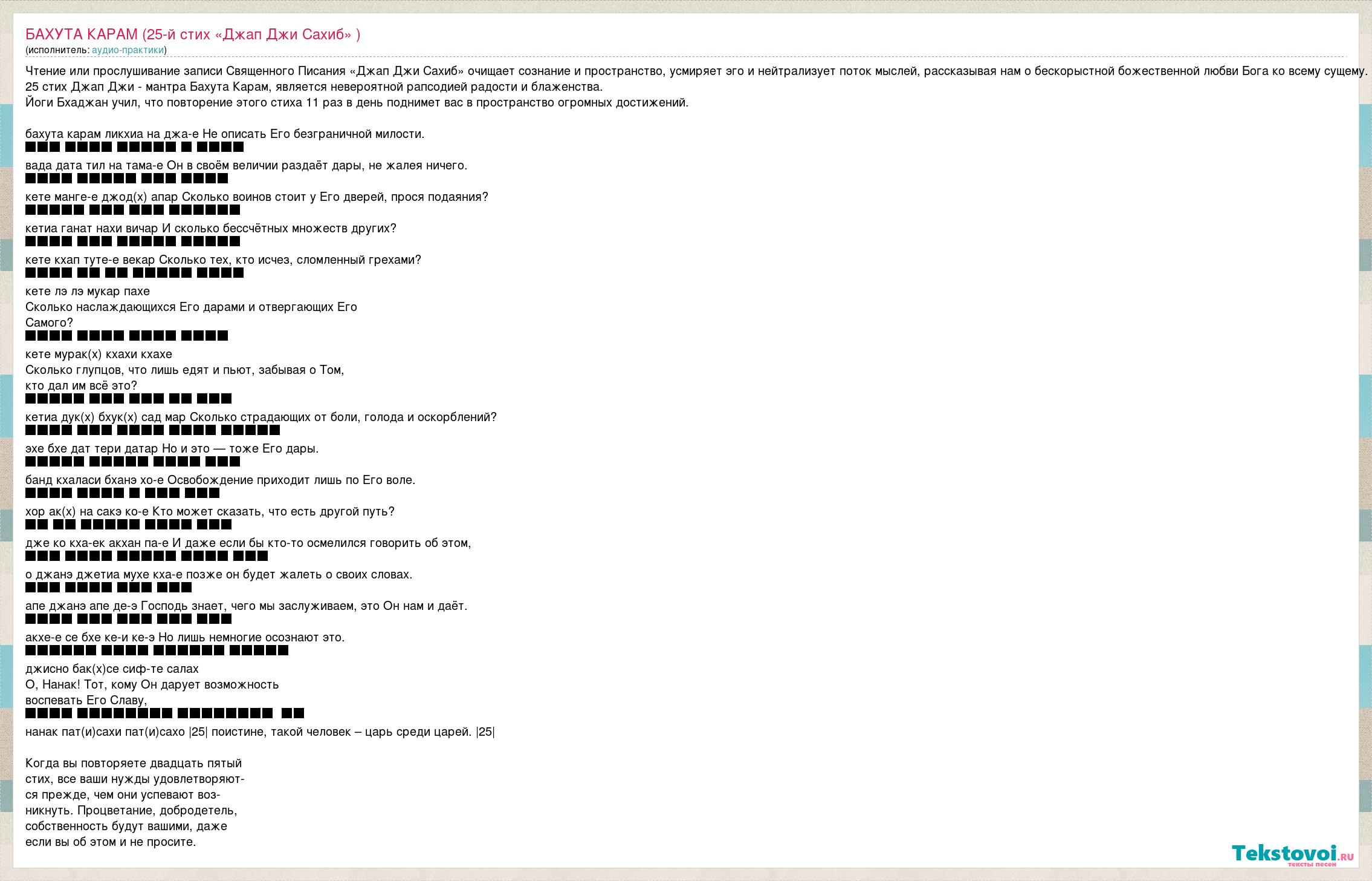 Чтение или прослушивание записи Священного Писания «Джап Джи Сахиб» очищает сознание и пространство, усмиряет эго и нейтрализует поток мыслей, рассказывая нам о бескорыстной божественной любви Бога ко всему сущему. 25 стих Джап Джи - мантра Бахута Карам, является невероятной рапсодией радости и блаженства. Йоги Бхаджан учил, что повторение этого стиха 11 раз в день поднимет вас в пространство огромных достижений. бахута карам ликхиа на джа-е Не описать Его безграничной милости. ਵਡਾ ਦਾਤਾ ਿਤਲੁ ਨ ਤਮਾਇ ॥ вада дата тил на тама-е Он в своём величии раздаёт дары, не жалея ничего. ਕੇਤੇ ਮੰਗਿਹ ਜੋਧ ਅਪਾਰ ॥ кете манге-е джод(х) апар Сколько воинов стоит у Его дверей, прося подаяния? ਕੇਿਤਆ ਗਣਤ ਨਹੀ ਵੀਚਾਰੁ ॥ кетиа ганат нахи вичар И сколько бессчётных множеств других? ਕੇਤੇ ਖਿਪ ਤੁਟਿਹ ਵੇਕਾਰ ॥ кете кхап туте-е векар Сколько тех, кто исчез, сломленный грехами? ਕੇਤੇ ਲੈ ਲੈ ਮੁਕਰੁ ਪਾਿਹ ॥ кете лэ лэ мукар пахе Сколько наслаждающихся Его дарами и отвергающих Его Самого? ਕੇਤੇ ਮੂਰਖ ਖਾਹੀ ਖਾਿਹ ॥ кете мурак(х) кхахи кхахе Сколько глупцов, что лишь едят и пьют, забывая о Том, кто дал им всё это? ਕੇਿਤਆ ਦੂਖ ਭੂਖ ਸਦ ਮਾਰ ॥ кетиа дук(х) бхук(х) сад мар Сколько страдающих от боли, голода и оскорблений? ਏਿਹ ਿਭ ਦਾਿਤ ਤੇਰੀ ਦਾਤਾਰ ॥ эхе бхе дат тери датар Но и это — тоже Его дары. ਬੰਿਦ ਖਲਾਸੀ ਭਾਣੈ ਹੋਇ ॥ банд кхаласи бханэ хо-е Освобождение приходит лишь по Его воле. ਹੋਰੁ ਆਿਖ ਨ ਸਕੈ ਕੋਇ ॥ хор ак(х) на сакэ ко-е Кто может сказать, что есть другой путь? ਜੇ ਕੋ ਖਾਇਕੁ ਆਖਿਣ ਪਾਇ ॥ дже ко кха-ек акхан па-е И даже если бы кто-то осмелился говорить об этом, ਓਹੁ ਜਾਣੈ ਜੇਤੀਆ ਮੁਿਹ ਖਾਇ ॥ о джанэ джетиа мухе кха-е позже он будет жалеть о своих словах. ਆਪੇ ਜਾਣੈ ਆਪੇ ਦੇਇ ॥ апе джанэ апе де-э Господь знает, чего мы заслуживаем, это Он нам и даёт. ਆਖਿਹ ਿਸ ਿਭ ਕੇਈ ਕੇਇ ॥ акхе-е се бхе ке-и ке-э Но лишь немногие осознают это. ਿਜਸਨੋ ਬਖਸੇ ਿਸਫਿਤ ਸਾਲਾਹ ॥ джисно бак(х)се сиф-те салах О, Нанак! Тот, кому Он дарует возможность воспевать Его Славу, ਨਾਨਕ ਪਾਿਤਸਾਹੀ ਪਾਿਤਸਾਹੁ ॥੨੫॥ нанак пат(и)сахи пат(и)сахо |25| поистине, такой человек – царь среди царей. |25| Когда вы повторяете двадцать пятый стих, все ваши нужды удовлетворяют- ся прежде, чем они успевают воз- никнуть. Процветание, добродетель, собственность будут вашими, даже если вы об этом и не просите.