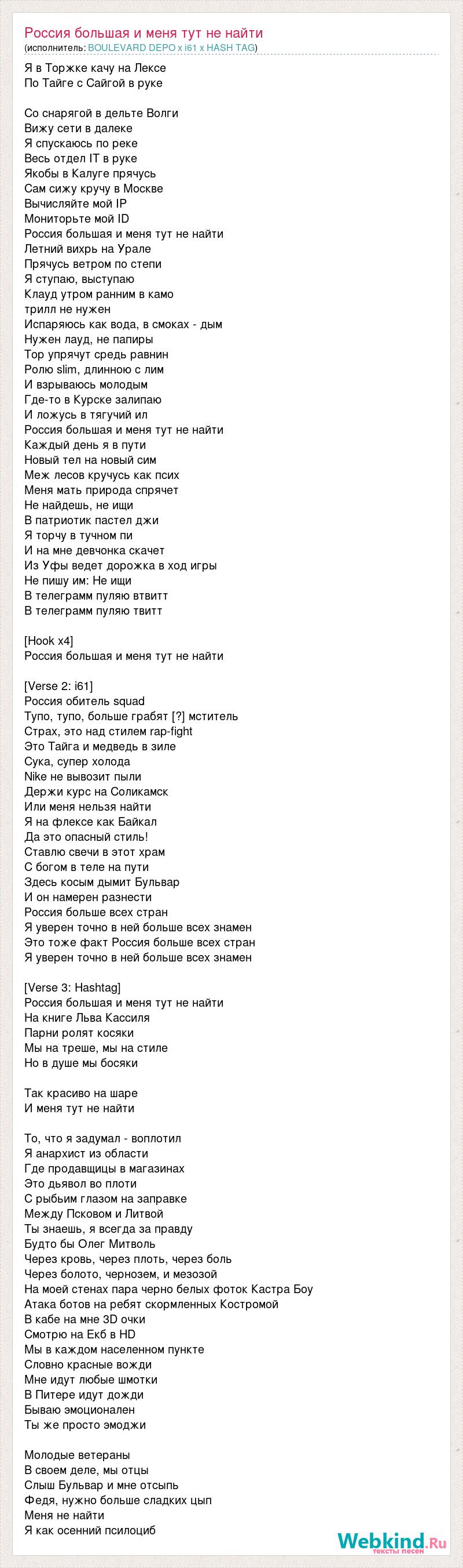 Я в Торжке качу на Лексе По Тайге с Сайгой в руке Со снарягой в дельте Волги Вижу сети в далеке Я спускаюсь по реке Весь отдел IT в руке Якобы в Калуге прячусь Сам сижу кручу в Москве Вычисляйте мой IP Мониторьте мой ID Россия большая и меня тут не найти Летний вихрь на Урале Прячусь ветром по степи Я ступаю, выступаю Клауд утром ранним в камо трилл не нужен Испаряюсь как вода, в смоках - дым Нужен лауд, не папиры Тор упрячут средь равнин Ролю slim, длинною с лим И взрываюсь молодым Где-то в Курске залипаю И ложусь в тягучий ил Россия большая и меня тут не найти Каждый день я в пути Новый тел на новый сим Меж лесов кручусь как псих Меня мать природа спрячет Не найдешь, не ищи В патриотик пастел джи Я торчу в тучном пи И на мне девчонка скачет Из Уфы ведет дорожка в ход игры Не пишу им: Не ищи В телеграмм пуляю втвитт В телеграмм пуляю твитт [Hook x4] Россия большая и меня тут не найти [Verse 2: i61] Россия обитель squad Тупо, тупо, больше грабят [?] мститель Страх, это над стилем rap-fight Это Тайга и медведь в зиле Сука, супер холода Nike не вывозит пыли Держи курс на Соликамск Или меня нельзя найти Я на флексе как Байкал Да это опасный стиль! Ставлю свечи в этот храм С богом в теле на пути Здесь косым дымит Бульвар И он намерен разнести Россия больше всех стран Я уверен точно в ней больше всех знамен Это тоже факт Россия больше всех стран Я уверен точно в ней больше всех знамен [Verse 3: Hashtag] Россия большая и меня тут не найти На книге Льва Кассиля Парни ролят косяки Мы на треше, мы на стиле Но в душе мы босяки Так красиво на шаре И меня тут не найти То, что я задумал - воплотил Я анархист из области Где продавщицы в магазинах Это дьявол во плоти С рыбьим глазом на заправке Между Псковом и Литвой Ты знаешь, я всегда за правду Будто бы Олег Митволь Через кровь, через плоть, через боль Через болото, чернозем, и мезозой На моей стенах пара черно белых фоток Кастра Боу Атака ботов на ребят скормленных Костромой В кабе на мне 3D очки Смотрю на Екб в HD Мы в каждом населенном пункте Словно красные вожди Мне идут любые шмотки В Питере идут дожди Бываю эмоционален Ты же просто эмоджи Молодые ветераны В своем деле, мы отцы Слыш Бульвар и мне отсыпь Федя, нужно больше сладких цып Меня не найти Я как осенний псилоциб