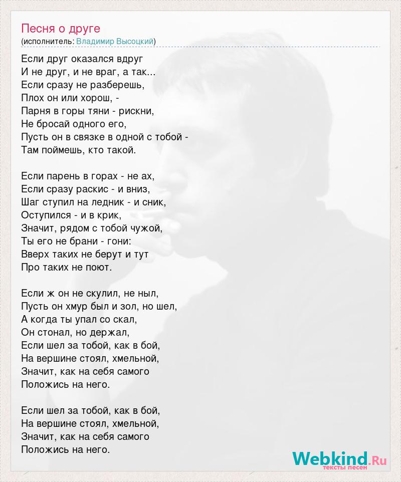Если друг оказался вдруг И не друг, и не враг, а так... Если сразу не разберешь, Плох он или хорош, - Парня в горы тяни - рискни, Не бросай одного его, Пусть он в связке в одной с тобой - Там поймешь, кто такой. Если парень в горах - не ах, Если сразу раскис - и вниз, Шаг ступил на ледник - и сник, Оступился - и в крик, Значит, рядом с тобой чужой, Ты его не брани - гони: Вверх таких не берут и тут Про таких не поют. Если ж он не скулил, не ныл, Пусть он хмур был и зол, но шел, А когда ты упал со скал, Он стонал, но держал, Если шел за тобой, как в бой, На вершине стоял, хмельной, Значит, как на себя самого Положись на него. Если шел за тобой, как в бой, На вершине стоял, хмельной, Значит, как на себя самого Положись на него.