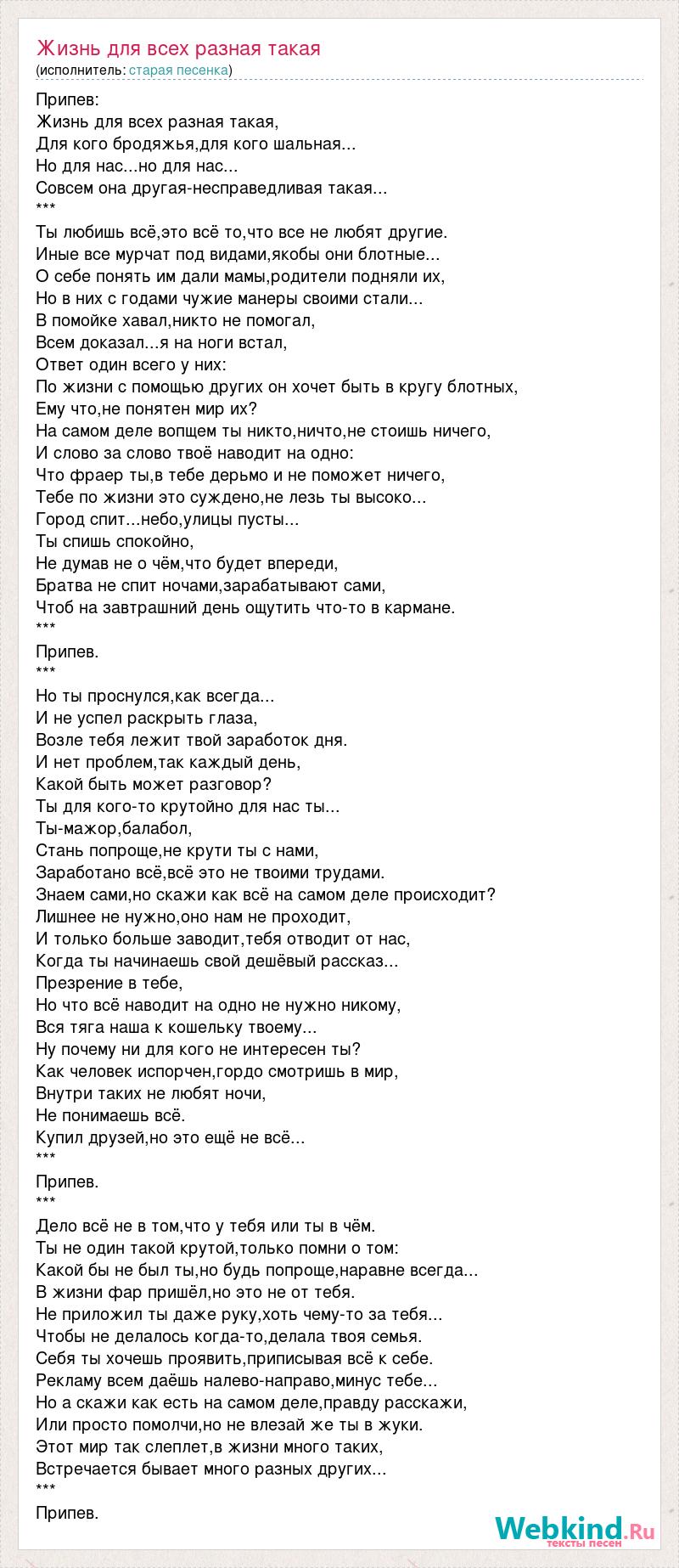 Припев: Жизнь для всех разная такая, Для кого бродяжья,для кого шальная... Но для нас...но для нас... Совсем она другая-несправедливая такая... *** Ты любишь всё,это всё то,что все не любят другие. Иные все мурчат под видами,якобы они блотные... О себе понять им дали мамы,родители подняли их, Но в них с годами чужие манеры своими стали... В помойке хавал,никто не помогал, Всем доказал...я на ноги встал, Ответ один всего у них: По жизни с помощью других он хочет быть в кругу блотных, Ему что,не понятен мир их? На самом деле вопщем ты никто,ничто,не стоишь ничего, И слово за слово твоё наводит на одно: Что фраер ты,в тебе дерьмо и не поможет ничего, Тебе по жизни это суждено,не лезь ты высоко... Город спит...небо,улицы пусты... Ты спишь спокойно, Не думав не о чём,что будет впереди, Братва не спит ночами,зарабатывают сами, Чтоб на завтрашний день ощутить что-то в кармане. *** Припев. *** Но ты проснулся,как всегда... И не успел раскрыть глаза, Возле тебя лежит твой заработок дня. И нет проблем,так каждый день, Какой быть может разговор? Ты для кого-то крутойно для нас ты... Ты-мажор,балабол, Стань попроще,не крути ты с нами, Заработано всё,всё это не твоими трудами. Знаем сами,но скажи как всё на самом деле происходит? Лишнее не нужно,оно нам не проходит, И только больше заводит,тебя отводит от нас, Когда ты начинаешь свой дешёвый рассказ... Презрение в тебе, Но что всё наводит на одно не нужно никому, Вся тяга наша к кошельку твоему... Ну почему ни для кого не интересен ты? Как человек испорчен,гордо смотришь в мир, Внутри таких не любят ночи, Не понимаешь всё. Купил друзей,но это ещё не всё... *** Припев. *** Дело всё не в том,что у тебя или ты в чём. Ты не один такой крутой,только помни о том: Какой бы не был ты,но будь попроще,наравне всегда... В жизни фар пришёл,но это не от тебя. Не приложил ты даже руку,хоть чему-то за тебя... Чтобы не делалось когда-то,делала твоя семья. Себя ты хочешь проявить,приписывая всё к себе. Рекламу всем даёшь налево-направо,минус тебе... Но а скажи как есть на самом деле,правду расскажи, Или просто помолчи,но не влезай же ты в жуки. Этот мир так слеплет,в жизни много таких, Встречается бывает много разных других... *** Припев.