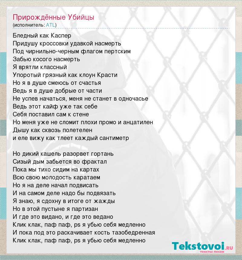 Бледный как Каспер Придушу кроссовки удавкой насмерть Под чирнильно-черным флагом пертским Забью косого насмерть Я врятли классный Упоротый грязный как клоун Красти Но я в душе смеюсь от счастья Ведь я в душе добрые от части Не успев начаться, меня не станет в одночасье Ведь этот кайф уже так себе Себя поставил сам к стене Но меня уже не сломит плохи промо и анцатилен Дышу как сквозь полетелен и еле вижу как тлеет каждый сантиметр Но дикий кашель разорвет гортань Сизый дым забьется во фрактал Пока мы тихо сидим на картах Всю свою молодость каратаем Но я на деле начал подвисать И на самом деле надо бы подвязать Я знаю, я сдохну в итоге от жажды Но в этой пустыне я партизан И где это видано, и где это ведано Клик клак, паф паф, ps я убью себя медленно И пока под это раскачивает кость тазобедренная Клик клак, паф паф, ps я убью себя медленно