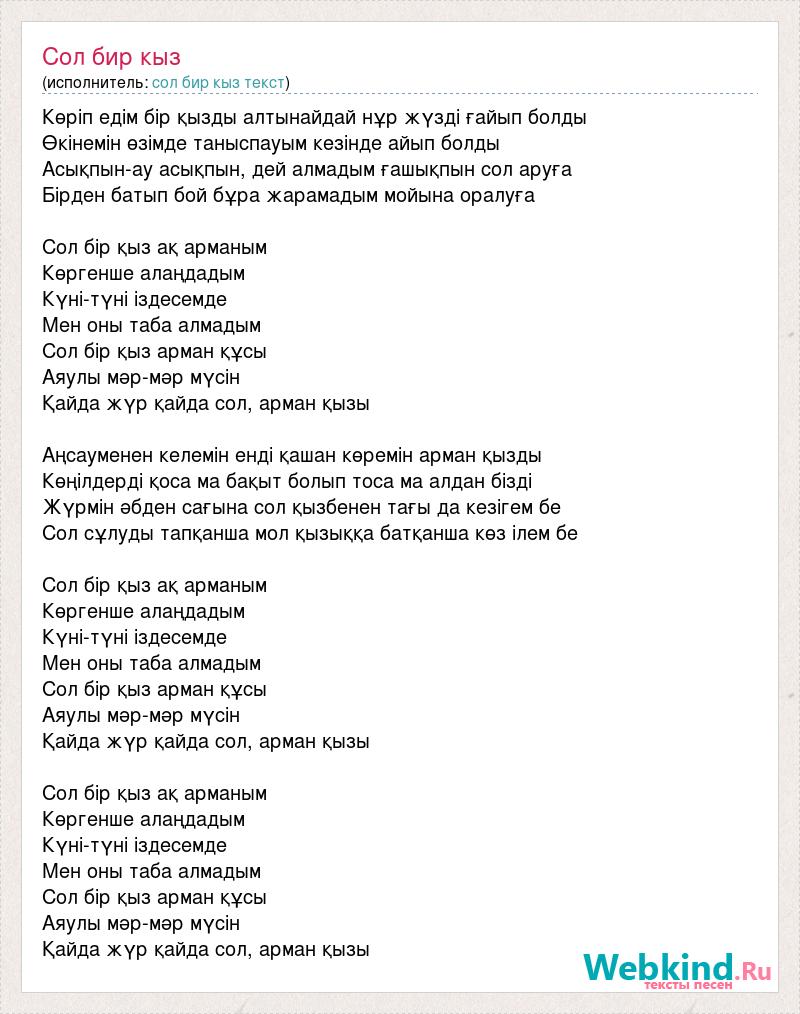 Көріп едім бір қызды алтынайдай нұр жүзді ғайып болды Өкінемін өзімде таныспауым кезінде айып болды Асықпын-ау асықпын, дей алмадым ғашықпын сол аруға Бірден батып бой бұра жарамадым мойына оралуға Сол бір қыз ақ арманым Көргенше алаңдадым Күні-түні іздесемде Мен оны таба алмадым Сол бір қыз арман құсы Аяулы мәр-мәр мүсін Қайда жүр қайда сол, арман қызы Аңсауменен келемін енді қашан көремін арман қызды Көңілдерді қоса ма бақыт болып тоса ма алдан бізді Жүрмін әбден сағына сол қызбенен тағы да кезігем бе Сол сұлуды тапқанша мол қызыққа батқанша көз ілем бе Сол бір қыз ақ арманым Көргенше алаңдадым Күні-түні іздесемде Мен оны таба алмадым Сол бір қыз арман құсы Аяулы мәр-мәр мүсін Қайда жүр қайда сол, арман қызы Сол бір қыз ақ арманым Көргенше алаңдадым Күні-түні іздесемде Мен оны таба алмадым Сол бір қыз арман құсы Аяулы мәр-мәр мүсін Қайда жүр қайда сол, арман қызы