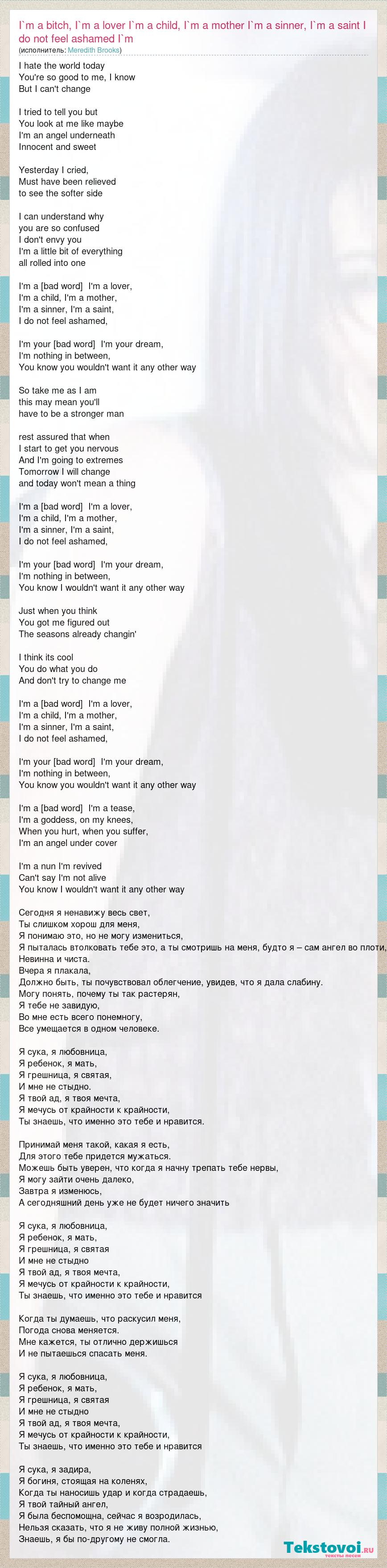 I hate the world today You're so good to me, I know But I can't change I tried to tell you but You look at me like maybe I'm an angel underneath Innocent and sweet Yesterday I cried, Must have been relieved to see the softer side I can understand why you are so confused I don't envy you I'm a little bit of everything all rolled into one I'm a [bad word] I'm a lover, I'm a child, I'm a mother, I'm a sinner, I'm a saint, I do not feel ashamed, I'm your hell, I'm your dream, I'm nothing in between, You know you wouldn't want it any other way So take me as I am this may mean you'll have to be a stronger man rest assured that when I start to get you nervous And I'm going to extremes Tomorrow I will change and today won't mean a thing I'm a [bad word] I'm a lover, I'm a child, I'm a mother, I'm a sinner, I'm a saint, I do not feel ashamed, I'm your hell, I'm your dream, I'm nothing in between, You know I wouldn't want it any other way Just when you think You got me figured out The seasons already changin' I think its cool You do what you do And don't try to change me I'm a [bad word] I'm a lover, I'm a child, I'm a mother, I'm a sinner, I'm a saint, I do not feel ashamed, I'm your hell, I'm your dream, I'm nothing in between, You know you wouldn't want it any other way I'm a [bad word] I'm a tease, I'm a goddess, on my knees, When you hurt, when you suffer, I'm an angel under cover I'm a nun I'm revived Can't say I'm not alive You know I wouldn't want it any other way Сегодня я ненавижу весь свет, Ты слишком хорош для меня, Я понимаю это, но не могу измениться, Я пыталась втолковать тебе это, а ты смотришь на меня, будто я – сам ангел во плоти, Невинна и чиста. Вчера я плакала, Должно быть, ты почувствовал облегчение, увидев, что я дала слабину. Могу понять, почему ты так растерян, Я тебе не завидую, Во мне есть всего понемногу, Все умещается в одном человеке. Я сука, я любовница, Я ребенок, я мать, Я грешница, я святая, И мне не стыдно. Я твой ад, я твоя мечта, Я мечусь от крайности к крайности, Ты знаешь, что именно это тебе и нравится. Принимай меня такой, какая я есть, Для этого тебе придется мужаться. Можешь быть уверен, что когда я начну трепать тебе нервы, Я могу зайти очень далеко, Завтра я изменюсь, А сегодняшний день уже не будет ничего значить Я сука, я любовница, Я ребенок, я мать, Я грешница, я святая И мне не стыдно Я твой ад, я твоя мечта, Я мечусь от крайности к крайности, Ты знаешь, что именно это тебе и нравится Когда ты думаешь, что раскусил меня, Погода снова меняется. Мне кажется, ты отлично держишься И не пытаешься спасать меня. Я сука, я любовница, Я ребенок, я мать, Я грешница, я святая И мне не стыдно Я твой ад, я твоя мечта, Я мечусь от крайности к крайности, Ты знаешь, что именно это тебе и нравится Я сука, я задира, Я богиня, стоящая на коленях, Когда ты наносишь удар и когда страдаешь, Я твой тайный ангел, Я была беспомощна, сейчас я возродилась, Нельзя сказать, что я не живу полной жизнью, Знаешь, я бы по-другому не смогла.