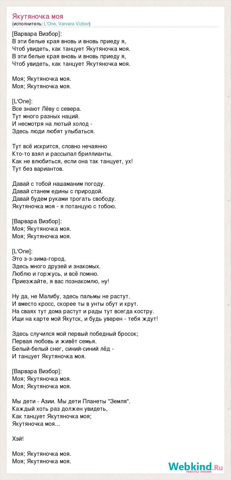 [Варвара Визбор]: В эти белые края вновь и вновь приеду я, Чтоб увидеть, как танцует Якутяночка моя. В эти белые края вновь и вновь приеду я, Чтоб увидеть, как танцует Якутяночка моя. Моя; Якутяночка моя. Моя; Якутяночка моя. [L'One]: Все знают Лёву с севера. Тут много разных наций. И несмотря на лютый холод - Здесь люди любят улыбаться. Тут всё искрится, словно нечаянно Кто-то взял и рассыпал бриллианты. Как не влюбиться, если она так танцует, ух! Тут без вариантов. Давай с тобой нашаманим погоду. Давай станем едины с природой. Давай будем руками трогать свободу. Якутяночка моя - я потанцую с тобою. [Варвара Визбор]: Моя; Якутяночка моя. Моя; Якутяночка моя. [L'One]: Это з-з-зима-город. Здесь много друзей и знакомых. Люблю и горжусь, и всё помню. Приезжайте, я вас познакомлю, ну! Ну да, не Малибу, здесь пальмы не растут. И вместо кросс, скорее ты в унты обут и крут. На сваях тут дома растут и рады тут всегда костру. Ищи на карте мой Якутск, и будь уверен - тебя ждут! Здесь случился мой первый победный бросок; Первая любовь и живёт семья. Белый-белый снег, синий-синий лёд - И танцует Якутяночка моя. [Варвара Визбор]: Моя; Якутяночка моя. Моя; Якутяночка моя. Мы дети - Азии. Мы дети Планеты "Земля". Каждый хоть раз должен увидеть, Как танцует Якутяночка моя; Якутяночка моя... Хэй! Моя; Якутяночка моя. Моя; Якутяночка моя.