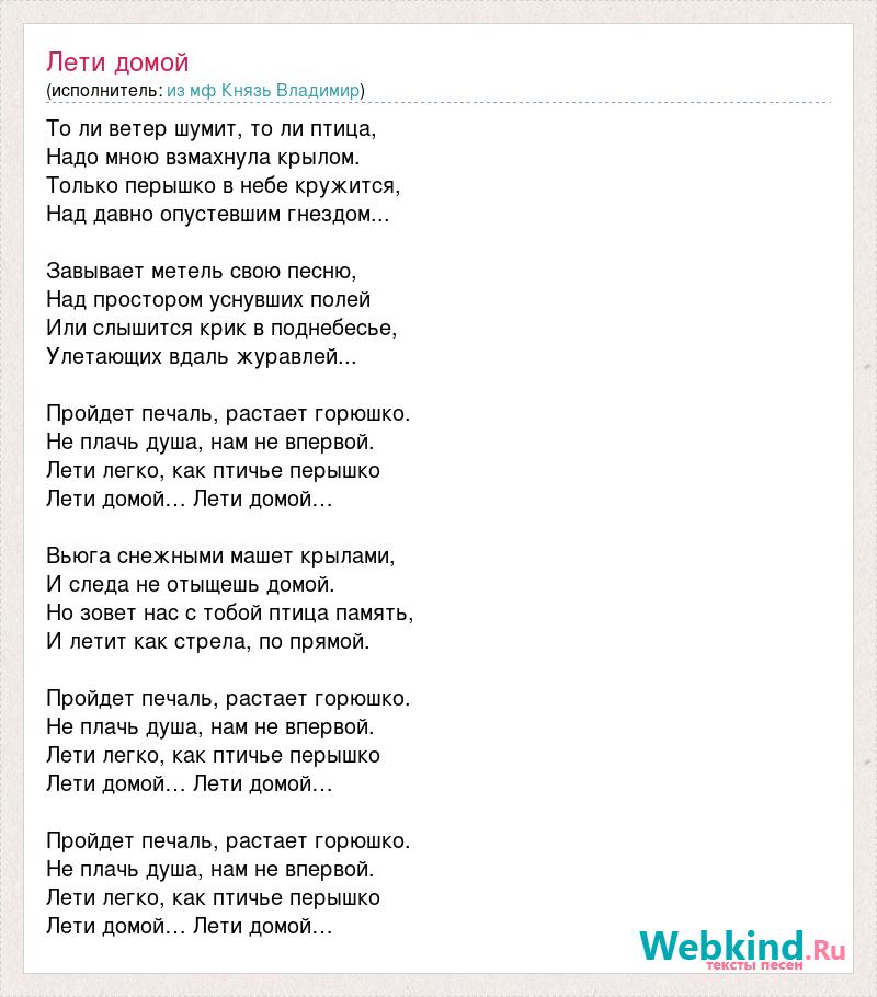 То ли ветер шумит, то ли птица, Надо мною взмахнула крылом. Только перышко в небе кружится, Над давно опустевшим гнездом... Завывает метель свою песню, Над простором уснувших полей Или слышится крик в поднебесье, Улетающих вдаль журавлей... Пройдет печаль, растает горюшко. Не плачь душа, нам не впервой. Лети легко, как птичье перышко Лети домой… Лети домой… Вьюга снежными машет крылами, И следа не отыщешь домой. Но зовет нас с тобой птица память, И летит как стрела, по прямой. Пройдет печаль, растает горюшко. Не плачь душа, нам не впервой. Лети легко, как птичье перышко Лети домой… Лети домой… Пройдет печаль, растает горюшко. Не плачь душа, нам не впервой. Лети легко, как птичье перышко Лети домой… Лети домой…