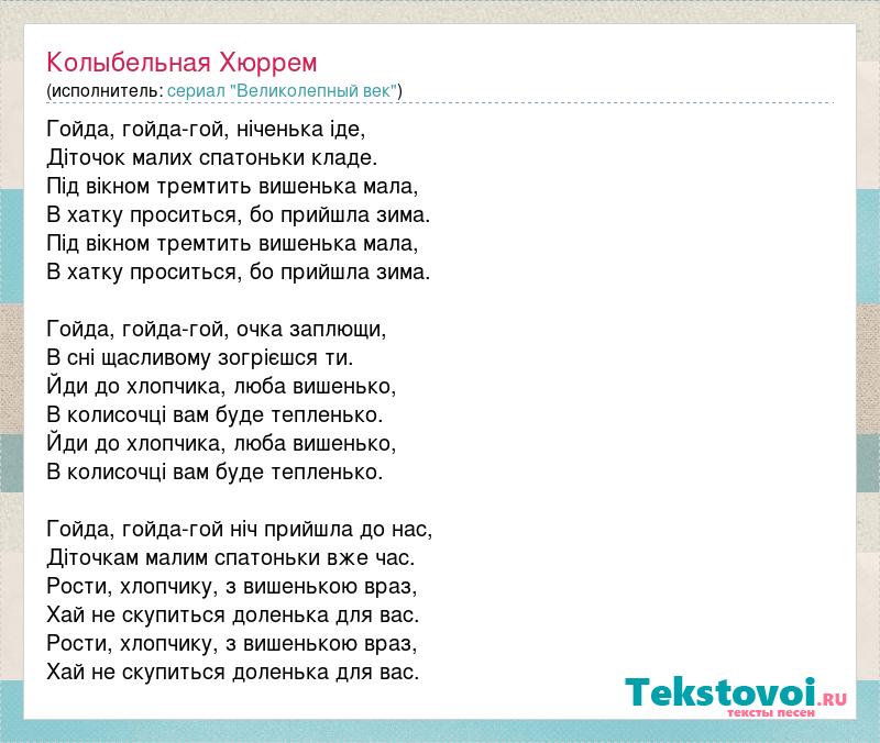 Гойда, гойда-гой, ніченька іде, Діточок малих спатоньки кладе. Під вікном тремтить вишенька мала, В хатку проситься, бо прийшла зима. Під вікном тремтить вишенька мала, В хатку проситься, бо прийшла зима. Гойда, гойда-гой, очка заплющи, В сні щасливому зогрієшся ти. Йди до хлопчика, люба вишенько, В колисочці вам буде тепленько. Йди до хлопчика, люба вишенько, В колисочці вам буде тепленько. Гойда, гойда-гой ніч прийшла до нас, Діточкам малим спатоньки вже час. Рости, хлопчику, з вишенькою враз, Хай не скупиться доленька для вас. Рости, хлопчику, з вишенькою враз, Хай не скупиться доленька для вас.