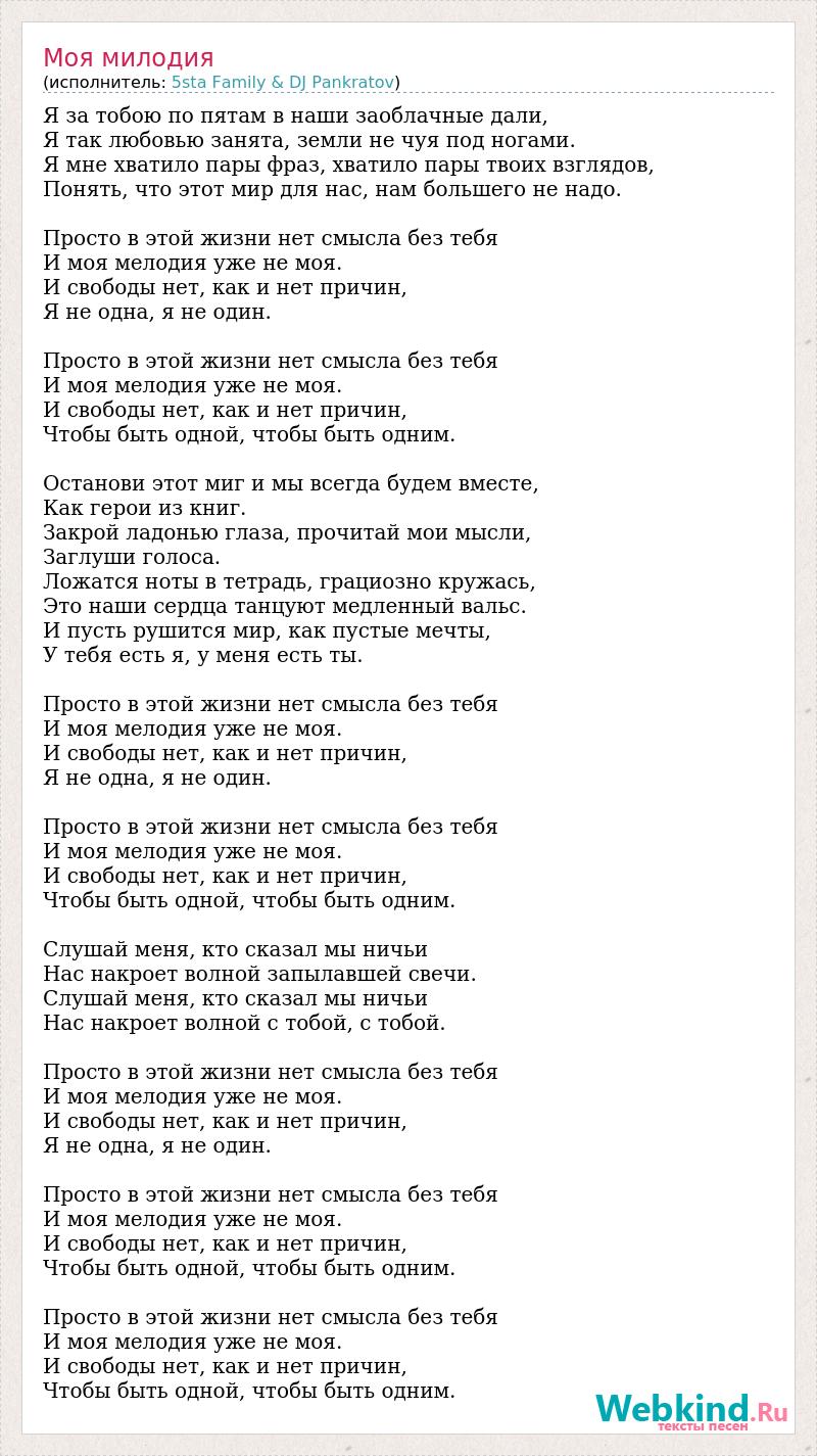 Я за тобою по пятам в наши заоблачные дали, Я так любовью занята, земли не чуя под ногами. Я мне хватило пары фраз, хватило пары твоих взглядов, Понять, что этот мир для нас, нам большего не надо. Просто в этой жизни нет смысла без тебя И моя мелодия уже не моя. И свободы нет, как и нет причин, Я не одна, я не один. Просто в этой жизни нет смысла без тебя И моя мелодия уже не моя. И свободы нет, как и нет причин, Чтобы быть одной, чтобы быть одним. Останови этот миг и мы всегда будем вместе, Как герои из книг. Закрой ладонью глаза, прочитай мои мысли, Заглуши голоса. Ложатся ноты в тетрадь, грациозно кружась, Это наши сердца танцуют медленный вальс. И пусть рушится мир, как пустые мечты, У тебя есть я, у меня есть ты. Просто в этой жизни нет смысла без тебя И моя мелодия уже не моя. И свободы нет, как и нет причин, Я не одна, я не один. Просто в этой жизни нет смысла без тебя И моя мелодия уже не моя. И свободы нет, как и нет причин, Чтобы быть одной, чтобы быть одним. Слушай меня, кто сказал мы ничьи Нас накроет волной запылавшей свечи. Слушай меня, кто сказал мы ничьи Нас накроет волной с тобой, с тобой. Просто в этой жизни нет смысла без тебя И моя мелодия уже не моя. И свободы нет, как и нет причин, Я не одна, я не один. Просто в этой жизни нет смысла без тебя И моя мелодия уже не моя. И свободы нет, как и нет причин, Чтобы быть одной, чтобы быть одним. Просто в этой жизни нет смысла без тебя И моя мелодия уже не моя. И свободы нет, как и нет причин, Чтобы быть одной, чтобы быть одним.
