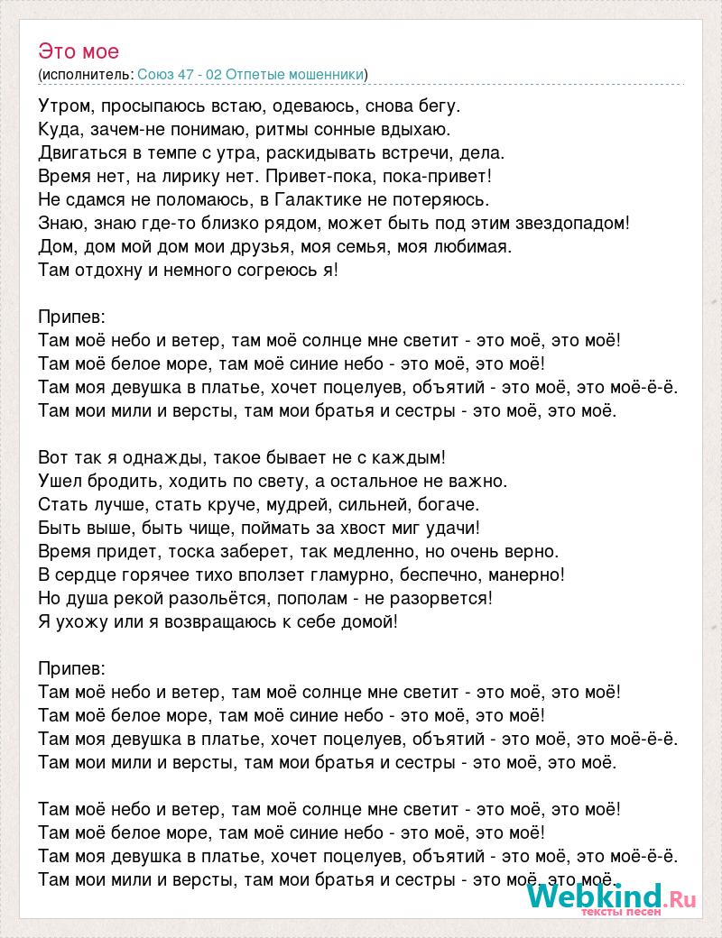 Утром, просыпаюсь встаю, одеваюсь, снова бегу. Куда, зачем-не понимаю, ритмы сонные вдыхаю. Двигаться в темпе с утра, раскидывать встречи, дела. Время нет, на лирику нет. Привет-пока, пока-привет! Не сдамся не поломаюсь, в Галактике не потеряюсь. Знаю, знаю где-то близко рядом, может быть под этим звездопадом! Дом, дом мой дом мои друзья, моя семья, моя любимая. Там отдохну и немного согреюсь я! Припев: Там моё небо и ветер, там моё солнце мне светит - это моё, это моё! Там моё белое море, там моё синие небо - это моё, это моё! Там моя девушка в платье, хочет поцелуев, объятий - это моё, это моё-ё-ё. Там мои мили и версты, там мои братья и сестры - это моё, это моё. Вот так я однажды, такое бывает не с каждым! Ушел бродить, ходить по свету, а остальное не важно. Стать лучше, стать круче, мудрей, сильней, богаче. Быть выше, быть чище, поймать за хвост миг удачи! Время придет, тоска заберет, так медленно, но очень верно. В сердце горячее тихо вползет гламурно, беспечно, манерно! Но душа рекой разольётся, пополам - не разорвется! Я ухожу или я возвращаюсь к себе домой! Припев: Там моё небо и ветер, там моё солнце мне светит - это моё, это моё! Там моё белое море, там моё синие небо - это моё, это моё! Там моя девушка в платье, хочет поцелуев, объятий - это моё, это моё-ё-ё. Там мои мили и версты, там мои братья и сестры - это моё, это моё. Там моё небо и ветер, там моё солнце мне светит - это моё, это моё! Там моё белое море, там моё синие небо - это моё, это моё! Там моя девушка в платье, хочет поцелуев, объятий - это моё, это моё-ё-ё. Там мои мили и версты, там мои братья и сестры - это моё, это моё.