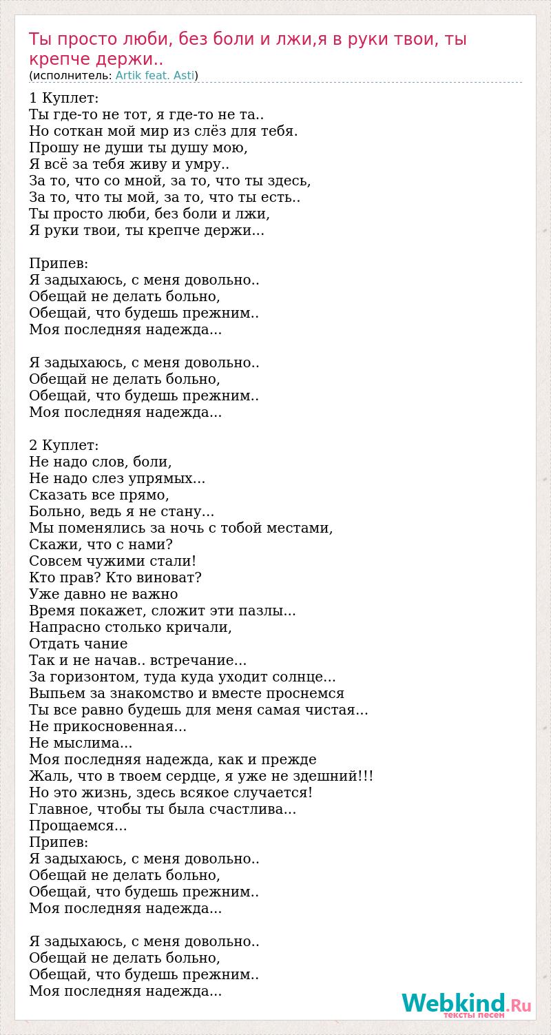 1 Куплет: Ты где-то не тот, я где-то не та.. Но соткан мой мир из слёз для тебя. Прошу не души ты душу мою, Я всё за тебя живу и умру.. За то, что со мной, за то, что ты здесь, За то, что ты мой, за то, что ты есть.. Ты просто люби, без боли и лжи, Я руки твои, ты крепче держи... Припев: Я задыхаюсь, с меня довольно.. Обещай не делать больно, Обещай, что будешь прежним.. Моя последняя надежда... Я задыхаюсь, с меня довольно.. Обещай не делать больно, Обещай, что будешь прежним.. Моя последняя надежда... 2 Куплет: Не надо слов, боли, Не надо слез упрямых... Сказать все прямо, Больно, ведь я не стану... Мы поменялись за ночь с тобой местами, Скажи, что с нами? Совсем чужими стали! Кто прав? Кто виноват? Уже давно не важно Время покажет, сложит эти пазлы... Напрасно столько кричали, Отдать чание Так и не начав.. встречание... За горизонтом, туда куда уходит солнце... Выпьем за знакомство и вместе проснемся Ты все равно будешь для меня самая чистая... Не прикосновенная... Не мыслима... Моя последняя надежда, как и прежде Жаль, что в твоем сердце, я уже не здешний!!! Но это жизнь, здесь всякое случается! Главное, чтобы ты была счастлива... Прощаемся... Припев: Я задыхаюсь, с меня довольно.. Обещай не делать больно, Обещай, что будешь прежним.. Моя последняя надежда... Я задыхаюсь, с меня довольно.. Обещай не делать больно, Обещай, что будешь прежним.. Моя последняя надежда...