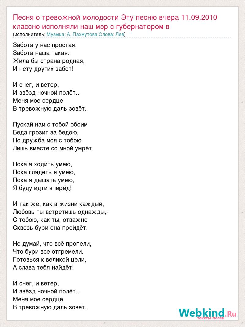 Главная→Исполнители→Музыка: А. Пахмутова Слова: Лев→Песня о тревожной молодости Эту песню вчера 11.09.2010 классно исполняли наш мэр