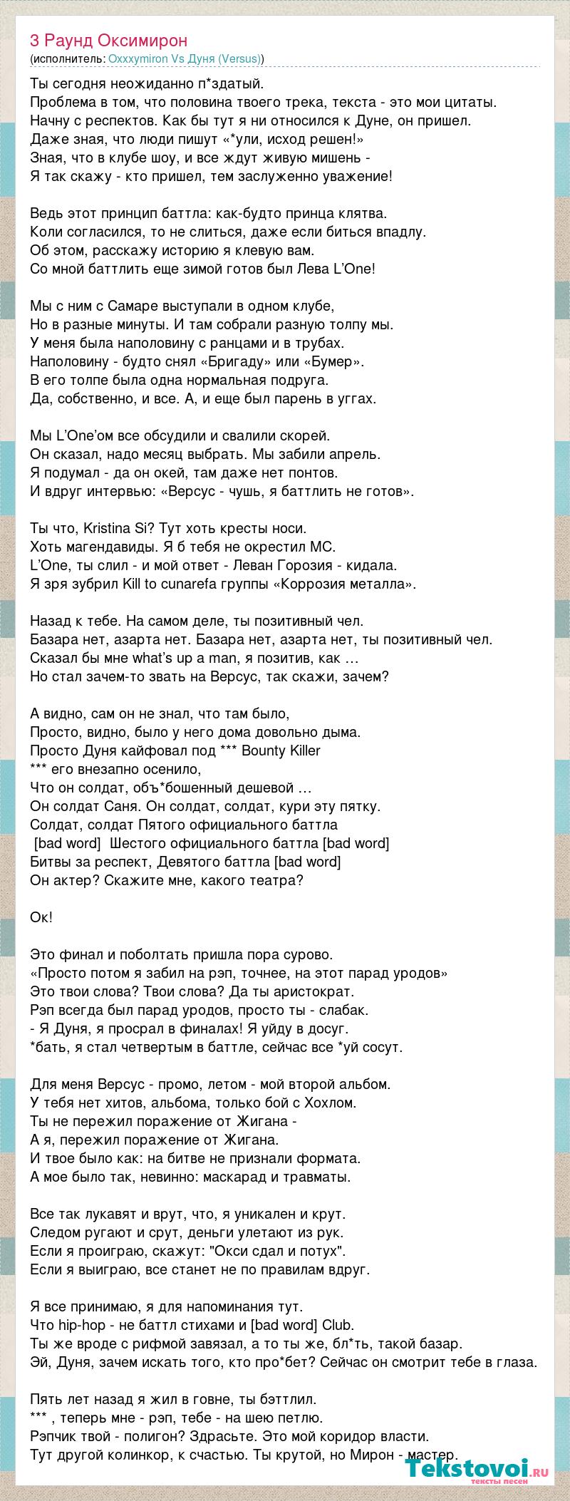Ты сегодня неожиданно п*здатый. Проблема в том, что половина твоего трека, текста - это мои цитаты. Начну с респектов. Как бы тут я ни относился к Дуне, он пришел. Даже зная, что люди пишут «*ули, исход решен!» Зная, что в клубе шоу, и все ждут живую мишень - Я так скажу - кто пришел, тем заслуженно уважение! Ведь этот принцип баттла: как-будто принца клятва. Коли согласился, то не слиться, даже если биться впадлу. Об этом, расскажу историю я клевую вам. Со мной баттлить еще зимой готов был Лева L’One! Мы с ним с Самаре выступали в одном клубе, Но в разные минуты. И там собрали разную толпу мы. У меня была наполовину с ранцами и в трубах. Наполовину - будто снял «Бригаду» или «Бумер». В его толпе была одна нормальная подруга. Да, собственно, и все. А, и еще был парень в уггах. Мы L’One’ом все обсудили и свалили скорей. Он сказал, надо месяц выбрать. Мы забили апрель. Я подумал - да он окей, там даже нет понтов. И вдруг интервью: «Версус - чушь, я баттлить не готов». Ты что, Kristina Si? Тут хоть кресты носи. Хоть магендавиды. Я б тебя не окрестил МС. L’One, ты слил - и мой ответ - Леван Горозия - кидала. Я зря зубрил Kill to cunarefa группы «Коррозия металла». Назад к тебе. На самом деле, ты позитивный чел. Базара нет, азарта нет. Базара нет, азарта нет, ты позитивный чел. Сказал бы мне what’s up a man, я позитив, как … Но стал зачем-то звать на Версус, так скажи, зачем? А видно, сам он не знал, что там было, Просто, видно, было у него дома довольно дыма. Просто Дуня кайфовал под *** Bounty Killer *** его внезапно осенило, Что он солдат, объ*бошенный дешевой … Он солдат Саня. Он солдат, солдат, кури эту пятку. Солдат, солдат Пятого официального баттла [bad word] Шестого официального баттла [bad word] Битвы за респект, Девятого баттла [bad word] Он актер? Скажите мне, какого театра? Ок! Это финал и поболтать пришла пора сурово. «Просто потом я забил на рэп, точнее, на этот парад уродов» Это твои слова? Твои слова? Да ты аристократ. Рэп всегда был парад уродов, просто ты - слабак. - Я Дуня, я просрал в финалах! Я уйду в досуг. *бать, я стал четвертым в баттле, сейчас все *уй сосут. Для меня Версус - промо, летом - мой второй альбом. У тебя нет хитов, альбома, только бой с Хохлом. Ты не пережил поражение от Жигана - А я, пережил поражение от Жигана. И твое было как: на битве не признали формата. А мое было так, невинно: маскарад и травматы. Все так лукавят и врут, что, я уникален и крут. Следом ругают и срут, деньги улетают из рук. Если я проиграю, скажут: "Окси сдал и потух". Если я выиграю, все станет не по правилам вдруг. Я все принимаю, я для напоминания тут. Что hip-hop - не баттл стихами и [bad word] Club. Ты же вроде с рифмой завязал, а то ты же, бл*ть, такой базар. Эй, Дуня, зачем искать того, кто про*бет? Сейчас он смотрит тебе в глаза. Пять лет назад я жил в говне, ты бэттлил. *** , теперь мне - рэп, тебе - на шею петлю. Рэпчик твой - полигон? Здрасьте. Это мой коридор власти. Тут другой колинкор, к счастью. Ты крутой, но Мирон - мастер.