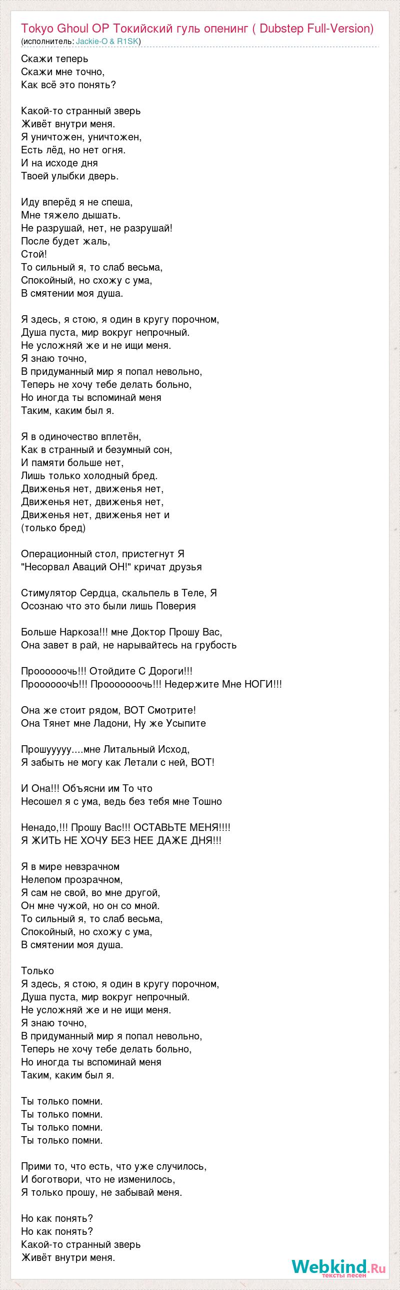 Скажи теперь Скажи мне точно, Как всё это понять? Какой-то странный зверь Живёт внутри меня. Я уничтожен, уничтожен, Есть лёд, но нет огня. И на исходе дня Твоей улыбки дверь. Иду вперёд я не спеша, Мне тяжело дышать. Не разрушай, нет, не разрушай! После будет жаль, Стой! То сильный я, то слаб весьма, Спокойный, но схожу с ума, В смятении моя душа. Я здесь, я стою, я один в кругу порочном, Душа пуста, мир вокруг непрочный. Не усложняй же и не ищи меня. Я знаю точно, В придуманный мир я попал невольно, Теперь не хочу тебе делать больно, Но иногда ты вспоминай меня Таким, каким был я. Я в одиночество вплетён, Как в странный и безумный сон, И памяти больше нет, Лишь только холодный бред. Движенья нет, движенья нет, Движенья нет, движенья нет, Движенья нет, движенья нет и (только бред) Операционный стол, пристегнут Я "Несорвал Аваций ОН!" кричат друзья Стимулятор Сердца, скальпель в Теле, Я Осознаю что это были лишь Поверия Больше Наркоза!!! мне Доктор Прошу Вас, Она завет в рай, не нарывайтесь на грубость Проооооочь!!! Отойдите С Дороги!!! ПроооооочЬ!!! Прооооооочь!!! Недержите Мне НОГИ!!! Она же стоит рядом, ВОТ Смотрите! Она Тянет мне Ладони, Ну же Усыпите Прошууууу....мне Литальный Исход, Я забыть не могу как Летали с ней, ВОТ! И Она!!! Объясни им То что Несошел я с ума, ведь без тебя мне Тошно Ненадо,!!! Прошу Вас!!! ОСТАВЬТЕ МЕНЯ!!!! Я ЖИТЬ НЕ ХОЧУ БЕЗ НЕЕ ДАЖЕ ДНЯ!!! Я в мире невзрачном Нелепом прозрачном, Я сам не свой, во мне другой, Он мне чужой, но он со мной. То сильный я, то слаб весьма, Спокойный, но схожу с ума, В смятении моя душа. Только Я здесь, я стою, я один в кругу порочном, Душа пуста, мир вокруг непрочный. Не усложняй же и не ищи меня. Я знаю точно, В придуманный мир я попал невольно, Теперь не хочу тебе делать больно, Но иногда ты вспоминай меня Таким, каким был я. Ты только помни. Ты только помни. Ты только помни. Ты только помни. Прими то, что есть, что уже случилось, И боготвори, что не изменилось, Я только прошу, не забывай меня. Но как понять? Но как понять? Какой-то странный зверь Живёт внутри меня.