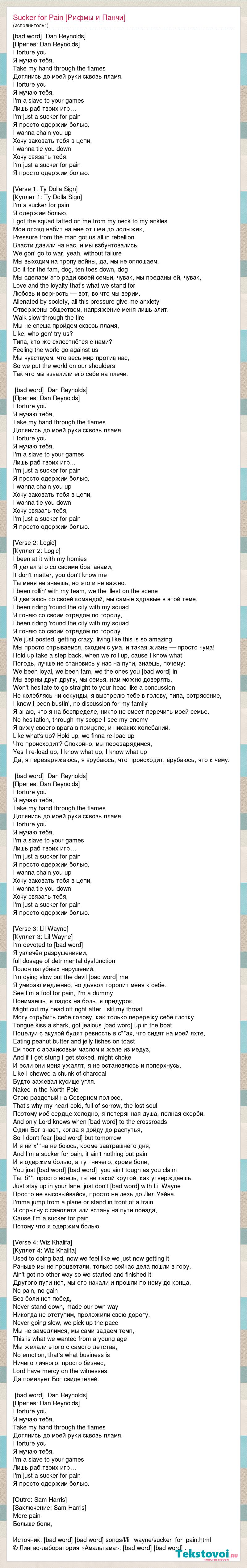 [bad word] Dan Reynolds] [Припев: Dan Reynolds] I torture you Я мучаю тебя, Take my hand through the flames Дотянись до моей руки сквозь пламя. I torture you Я мучаю тебя, I'm a slave to your games Лишь раб твоих игр… I'm just a sucker for pain Я просто одержим болью. I wanna chain you up Хочу заковать тебя в цепи, I wanna tie you down Хочу связать тебя, I'm just a sucker for pain Я просто одержим болью. [Verse 1: Ty Dolla Sign] [Куплет 1: Ty Dolla Sign] I'm a sucker for pain Я одержим болью, I got the squad tatted on me from my neck to my ankles Мои отряд набит на мне от шеи до лодыжек, Pressure from the man got us all in rebellion Власти давили на нас, и мы взбунтовались, We gon' go to war, yeah, without failure Мы выходим на тропу войны, да, мы не оплошаем, Do it for the fam, dog, ten toes down, dog Мы сделаем это ради своей семьи, чувак, мы преданы ей, чувак, Love and the loyalty that's what we stand for Любовь и верность — вот, во что мы верим. Alienated by society, all this pressure give me anxiety Отвержены обществом, напряжение меня лишь злит. Walk slow through the fire Мы не спеша пройдем сквозь пламя, Like, who gon' try us? Типа, кто же схлестнётся с нами? Feeling the world go against us Мы чувствуем, что весь мир против нас, So we put the world on our shoulders Так что мы взвалили его себе на плечи. [bad word] Dan Reynolds] [Припев: Dan Reynolds] I torture you Я мучаю тебя, Take my hand through the flames Дотянись до моей руки сквозь пламя. I torture you Я мучаю тебя, I'm a slave to your games Лишь раб твоих игр... I'm just a sucker for pain Я просто одержим болью. I wanna chain you up Хочу заковать тебя в цепи, I wanna tie you down Хочу связать тебя, I'm just a sucker for pain Я просто одержим болью. [Verse 2: Logic] [Куплет 2: Logic] I been at it with my homies Я делал это со своими братанами, It don't matter, you don't know me Ты меня не знаешь, но это и не важно. I been rollin' with my team, we the illest on the scene Я двигаюсь со своей командой, мы самые здравые в этой теме, I been riding 'round the city with my squad Я гоняю со своим отрядом по городу, I been riding 'round the city with my squad Я гоняю со своим отрядом по городу. We just posted, getting crazy, living like this is so amazing Мы просто отрываемся, сходим с ума, и такая жизнь — просто чума! Hold up take a step back, when we roll up, cause I know what Погодь, лучше не становись у нас на пути, знаешь, почему: We been loyal, we been fam, we the ones you [bad word] in Мы верны друг другу, мы семья, нам можно доверять. Won't hesitate to go straight to your head like a concussion Не колеблясь ни секунды, я выстрелю тебе в голову, типа, сотрясение, I know I been bustin', no discussion for my family Я знаю, что я на беспределе, никто не смеет перечить моей семье. No hesitation, through my scope I see my enemy Я вижу своего врага в прицеле, и никаких колебаний. Like what's up? Hold up, we finna re-load up Что происходит? Спокойно, мы перезарядимся, Yes I re-load up, I know what up, I know what up Да, я перезаряжаюсь, я врубаюсь, что происходит, врубаюсь, что к чему. [bad word] Dan Reynolds] [Припев: Dan Reynolds] I torture you Я мучаю тебя, Take my hand through the flames Дотянись до моей руки сквозь пламя. I torture you Я мучаю тебя, I'm a slave to your games Лишь раб твоих игр… I'm just a sucker for pain Я просто одержим болью. I wanna chain you up Хочу заковать тебя в цепи, I wanna tie you down Хочу связать тебя, I'm just a sucker for pain Я просто одержим болью. [Verse 3: Lil Wayne] [Куплет 3: Lil Wayne] I'm devoted to [bad word] Я увлечён разрушениями, full dosage of detrimental dysfunction Полон пагубных нарушений. I'm dying slow but the devil [bad word] me Я умираю медленно, но дьявол торопит меня к себе. See I'm a fool for pain, I'm a dummy Понимаешь, я падок на боль, я придурок, Might cut my head off right after I slit my throat Могу отрубить себе голову, как только перережу себе глотку. Tongue kiss a shark, got jealous [bad word] up in the boat Поцелуи с акулой будят ревность в с**ах, что сидят на моей яхте, Eating peanut butter and jelly fishes on toast Ем тост с арахисовым маслом и желе из медуз, And if I get stung I get stoked, might choke И если они меня ужалят, я не остановлюсь и поперхнусь, Like I chewed a chunk of charcoal Будто зажевал кусище угля. Naked in the North Pole Стою раздеты