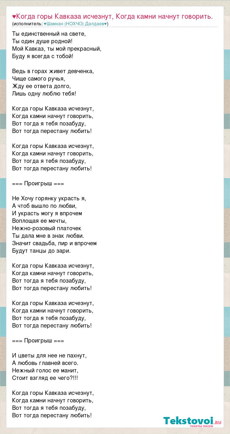 Ты единственный на свете, Ты один душе родной! Мой Кавказ, ты мой прекрасный, Буду я всегда с тобой! Ведь в горах живет девченка, Чище самого ручья, Жду ее ответа долго, Лишь одну люблю тебя! Когда горы Кавказа исчезнут, Когда камни начнут говорить, Вот тогда я тебя позабуду, Вот тогда перестану любить! Когда горы Кавказа исчезнут, Когда камни начнут говорить, Вот тогда я тебя позабуду, Вот тогда перестану любить! === Проигрыш === Не Хочу горянку украсть я, А чтоб вышло по любви, И украсть могу я впрочем Воплощая ее мечты, Нежно-розовый платочек Ты дала мне в знак любви. Значит свадьба, пир и впрочем Будут танцы до зари. Когда горы Кавказа исчезнут, Когда камни начнут говорить, Вот тогда я тебя позабуду, Вот тогда перестану любить! Когда горы Кавказа исчезнут, Когда камни начнут говорить, Вот тогда я тебя позабуду, Вот тогда перестану любить! === Проигрыш === И цветы для нее не пахнут, А любовь главней всего. Нежный голос ее манит, Стоит взгляд ее чего?!!! Когда горы Кавказа исчезнут, Когда камни начнут говорить, Вот тогда я тебя позабуду, Вот тогда перестану любить!