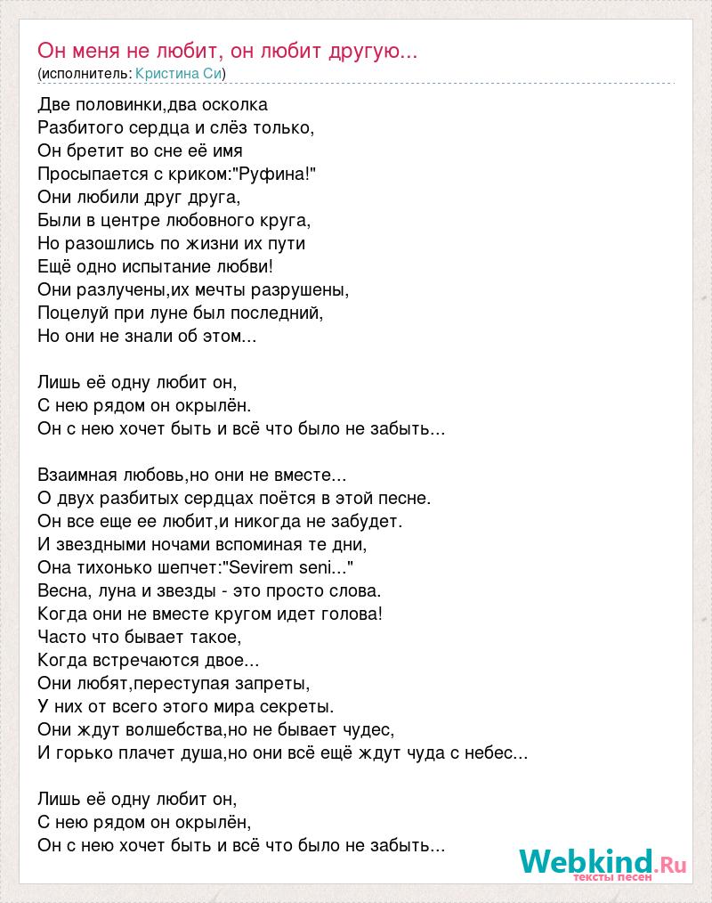 Две половинки,два осколка Разбитого сердца и слёз только, Он бретит во сне её имя Просыпается с криком:"Руфина!" Они любили друг друга, Были в центре любовного круга, Но разошлись по жизни их пути Ещё одно испытание любви! Они разлучены,их мечты разрушены, Поцелуй при луне был последний, Но они не знали об этом... Лишь её одну любит он, С нею рядом он окрылён. Он с нею хочет быть и всё что было не забыть... Взаимная любовь,но они не вместе... О двух разбитых сердцах поётся в этой песне. Он все еще ее любит,и никогда не забудет. И звездными ночами вспоминая те дни, Она тихонько шепчет:"Sevirem seni..." Весна, луна и звезды - это просто слова. Когда они не вместе кругом идет голова! Часто что бывает такое, Когда встречаются двое... Они любят,переступая запреты, У них от всего этого мира секреты. Они ждут волшебства,но не бывает чудес, И горько плачет душа,но они всё ещё ждут чуда с небес... Лишь её одну любит он, С нею рядом он окрылён, Он с нею хочет быть и всё что было не забыть...