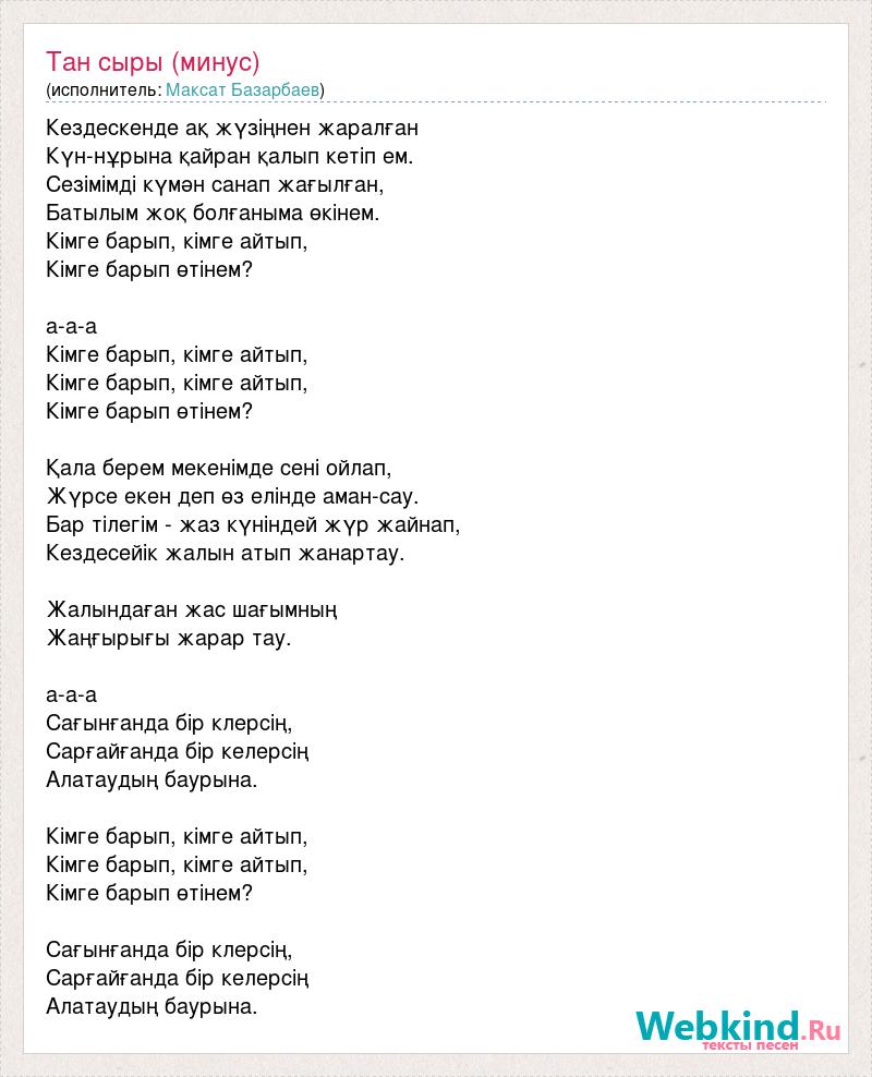 Кездескенде ақ жүзіңнен жаралған Күн-нұрына қайран қалып кетіп ем. Сезімімді күмән санап жағылған, Батылым жоқ болғаныма өкінем. Кімге барып, кімге айтып, Кімге барып өтінем? а-а-а Кімге барып, кімге айтып, Кімге барып, кімге айтып, Кімге барып өтінем? Қала берем мекенімде сені ойлап, Жүрсе екен деп өз елінде аман-сау. Бар тілегім - жаз күніндей жүр жайнап, Кездесейік жалын атып жанартау. Жалындаған жас шағымның Жаңғырығы жарар тау. а-а-а Сағынғанда бір клерсің, Сарғайғанда бір келерсің Алатаудың баурына. Кімге барып, кімге айтып, Кімге барып, кімге айтып, Кімге барып өтінем? Сағынғанда бір клерсің, Сарғайғанда бір келерсің Алатаудың баурына.
