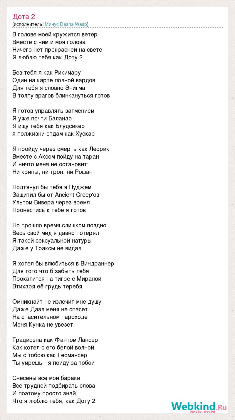 В голове моей кружится ветер Вместе с ним и моя голова Ничего нет прекрасней на свете Я люблю тебя как Доту 2 Без тебя я как Рикимару Один на карте полной вардов Для тебя я словно Энигма В толпу врагов блинкануться готов Я готов управлять затмением Я уже почти Баланар Я ищу тебя как Блудсикер я полжизни отдам как Хускар Я пройду через смерть как Леорик Вместе с Аксом пойду на таран И ничто меня не остановит: Ни крипы, ни трон, ни Рошан Подтянул бы тебя я Пуджем Защитил бы от Ancient Creep'ов Ультом Вивера через время Пронестись к тебе я готов Но прошло время слишком поздно Весь свой мид я давно потерял Я такой сексуальной натуры Даже у Траксы не видал Я хотел бы влюбиться в Виндраннер Для того что б забыть тебя Прокатится на тигре с Мираной Втихаря её грудь теребя Омникнайт не излечит мне душу Даже Дазл меня не спасет На спасительном пароходе Меня Кунка не увезет Грациозна как Фантом Лансер Как котел с его белой волной Мы с тобою как Геомансер Ты умрешь - я пойду за тобой Снесены все мои бараки Все трудней подбирать слова И поэтому просто знай, Что я люблю тебя, как Доту 2