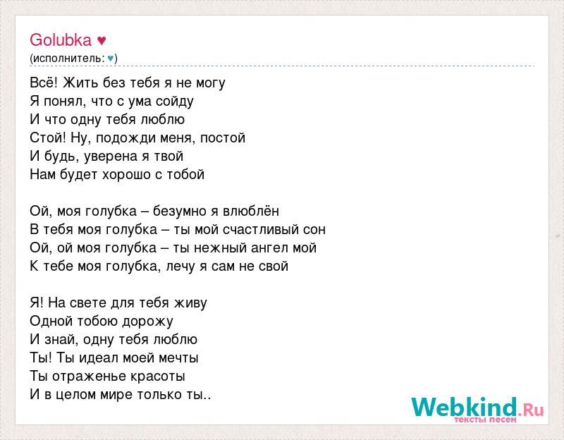 Всё! Жить без тебя я не могу Я понял, что с ума сойду И что одну тебя люблю Стой! Ну, подожди меня, постой И будь, уверена я твой Нам будет хорошо с тобой Ой, моя голубка – безумно я влюблён В тебя моя голубка – ты мой счастливый сон Ой, ой моя голубка – ты нежный ангел мой К тебе моя голубка, лечу я сам не свой Я! На свете для тебя живу Одной тобою дорожу И знай, одну тебя люблю Ты! Ты идеал моей мечты Ты отраженье красоты И в целом мире только ты..