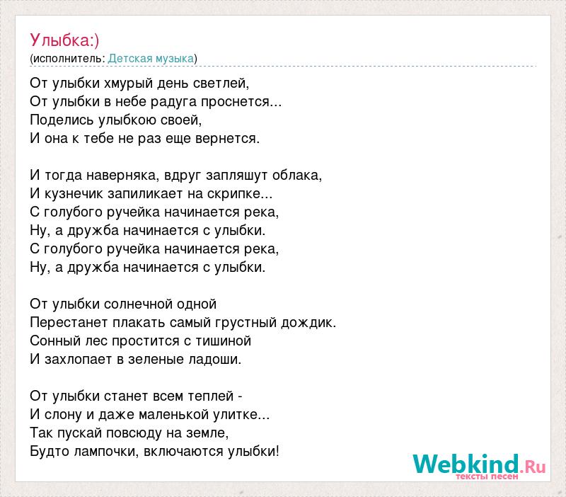 От улыбки хмурый день светлей, От улыбки в небе радуга проснется... Поделись улыбкою своей, И она к тебе не раз еще вернется. И тогда наверняка, вдруг запляшут облака, И кузнечик запиликает на скрипке... С голубого ручейка начинается река, Ну, а дружба начинается с улыбки. С голубого ручейка начинается река, Ну, а дружба начинается с улыбки. От улыбки солнечной одной Перестанет плакать самый грустный дождик. Сонный лес простится с тишиной И захлопает в зеленые ладоши. От улыбки станет всем теплей - И слону и даже маленькой улитке... Так пускай повсюду на земле, Будто лампочки, включаются улыбки!