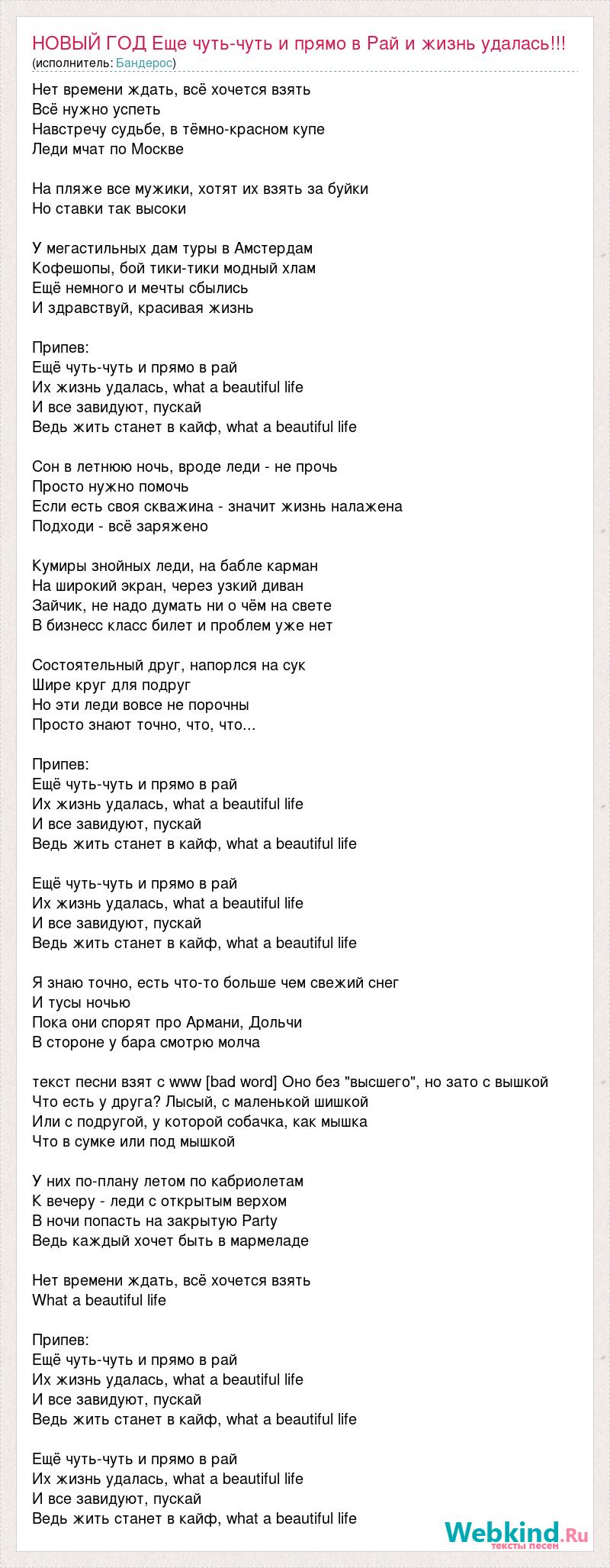 Нет времени ждать, всё хочется взять Всё нужно успеть Навстречу судьбе, в тёмно-красном купе Леди мчат по Москве На пляже все мужики, хотят их взять за буйки Но ставки так высоки У мегастильных дам туры в Амстердам Кофешопы, бой тики-тики модный хлам Ещё немного и мечты сбылись И здравствуй, красивая жизнь Припев: Ещё чуть-чуть и прямо в рай Их жизнь удалась, what a beautiful life И все завидуют, пускай Ведь жить станет в кайф, what a beautiful life Сон в летнюю ночь, вроде леди - не прочь Просто нужно помочь Если есть своя скважина - значит жизнь налажена Подходи - всё заряжено Кумиры знойных леди, на бабле карман На широкий экран, через узкий диван Зайчик, не надо думать ни о чём на свете В бизнесс класс билет и проблем уже нет Состоятельный друг, напорлся на сук Шире круг для подруг Но эти леди вовсе не порочны Просто знают точно, что, что... Припев: Ещё чуть-чуть и прямо в рай Их жизнь удалась, what a beautiful life И все завидуют, пускай Ведь жить станет в кайф, what a beautiful life Ещё чуть-чуть и прямо в рай Их жизнь удалась, what a beautiful life И все завидуют, пускай Ведь жить станет в кайф, what a beautiful life Я знаю точно, есть что-то больше чем свежий снег И тусы ночью Пока они спорят про Армани, Дольчи В стороне у бара смотрю молча текст песни взят с www [bad word] Оно без "высшего", но зато с вышкой Что есть у друга? Лысый, с маленькой шишкой Или с подругой, у которой собачка, как мышка Что в сумке или под мышкой У них по-плану летом по кабриолетам К вечеру - леди с открытым верхом В ночи попасть на закрытую Party Ведь каждый хочет быть в мармеладе Нет времени ждать, всё хочется взять What a beautiful life Припев: Ещё чуть-чуть и прямо в рай Их жизнь удалась, what a beautiful life И все завидуют, пускай Ведь жить станет в кайф, what a beautiful life Ещё чуть-чуть и прямо в рай Их жизнь удалась, what a beautiful life И все завидуют, пускай Ведь жить станет в кайф, what a beautiful life