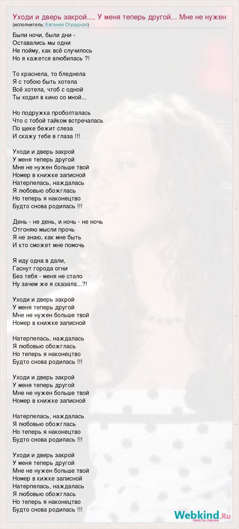 Были ночи, были дни - Оставались мы одни Не пойму, как всё случилось Но я кажется влюбилась ?! То краснела, то бледнела Я с тобою быть хотела Всё хотела, чтоб с одной Ты ходил в кино со мной... Но подружка проболталась Что с тобой тайком встречалась По щеке бежит слеза И скажу тебе в глаза !!! Уходи и дверь закрой У меня теперь другой Мне не нужен больше твой Номер в книжке записной Натерпелась, наждалась Я любовью обожглась Но теперь я наконецтво Будто снова родилась !!! День - не день, и ночь - не ночь Отгоняю мысли прочь Я не знаю, как мне быть И кто сможет мне помочь Я иду одна в дали, Гаснут города огни Без тебя - меня не стало Ну зачем же я сказала...?! Уходи и дверь закрой У меня теперь другой Мне не нужен больше твой Номер в книжке записной Натерпелась, наждалась Я любовью обожглась Но теперь я наконецтво Будто снова родилась !!! Уходи и дверь закрой У меня теперь другой Мне не нужен больше твой Номер в книжке записной Натерпелась, наждалась Я любовью обожглась Но теперь я наконецтво Будто снова родилась !!! Уходи и дверь закрой У меня теперь другой Мне не нужен больше твой Номер в кижке записной Натерпелась, наждалась Я любовью обожглась Но теперь я наконецтво Будто снова родилась !!!