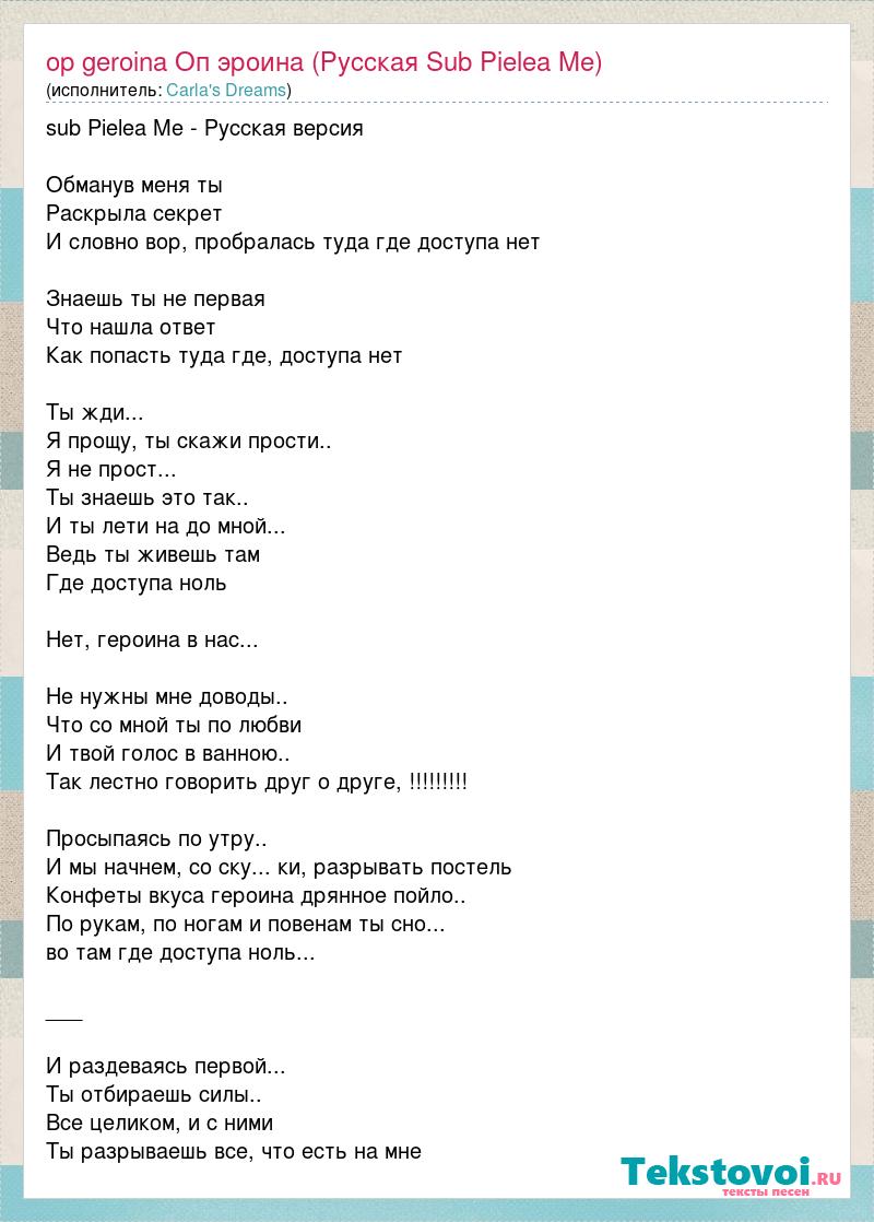 sub Pielea Me - Русская версия Обманув меня ты Раскрыла секрет И словно вор, пробралась туда где доступа нет Знаешь ты не первая Что нашла ответ Как попасть туда где, доступа нет Ты жди... Я прощу, ты скажи прости.. Я не прост... Ты знаешь это так.. И ты лети на до мной... Ведь ты живешь там Где доступа ноль Нет, героина в нас... Не нужны мне доводы.. Что со мной ты по любви И твой голос в ванною.. Так лестно говорить друг о друге, !!!!!!!!! Просыпаясь по утру.. И мы начнем, со ску... ки, разрывать постель Конфеты вкуса героина дрянное пойло.. По рукам, по ногам и повенам ты сно... во там где доступа ноль... ___ И раздеваясь первой... Ты отбираешь силы.. Все целиком, и с ними Ты разрываешь все, что есть на мне
