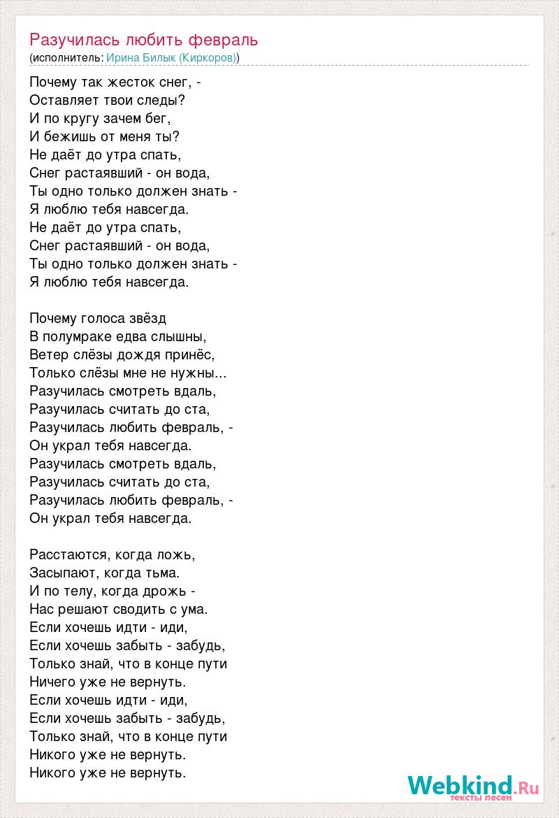 Почему так жесток снег, - Оставляет твои следы? И по кругу зачем бег, И бежишь от меня ты? Не даёт до утра спать, Снег растаявший - он вода, Ты одно только должен знать - Я люблю тебя навсегда. Не даёт до утра спать, Снег растаявший - он вода, Ты одно только должен знать - Я люблю тебя навсегда. Почему голоса звёзд В полумраке едва слышны, Ветер слёзы дождя принёс, Только слёзы мне не нужны... Разучилась смотреть вдаль, Разучилась считать до ста, Разучилась любить февраль, - Он украл тебя навсегда. Разучилась смотреть вдаль, Разучилась считать до ста, Разучилась любить февраль, - Он украл тебя навсегда. Расстаются, когда ложь, Засыпают, когда тьма. И по телу, когда дрожь - Нас решают сводить с ума. Если хочешь идти - иди, Если хочешь забыть - забудь, Только знай, что в конце пути Ничего уже не вернуть. Если хочешь идти - иди, Если хочешь забыть - забудь, Только знай, что в конце пути Никого уже не вернуть. Никого уже не вернуть.