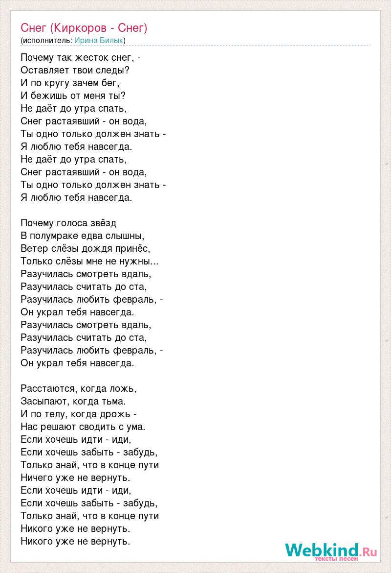 Почему так жесток снег, - Оставляет твои следы? И по кругу зачем бег, И бежишь от меня ты? Не даёт до утра спать, Снег растаявший - он вода, Ты одно только должен знать - Я люблю тебя навсегда. Не даёт до утра спать, Снег растаявший - он вода, Ты одно только должен знать - Я люблю тебя навсегда. Почему голоса звёзд В полумраке едва слышны, Ветер слёзы дождя принёс, Только слёзы мне не нужны... Разучилась смотреть вдаль, Разучилась считать до ста, Разучилась любить февраль, - Он украл тебя навсегда. Разучилась смотреть вдаль, Разучилась считать до ста, Разучилась любить февраль, - Он украл тебя навсегда. Расстаются, когда ложь, Засыпают, когда тьма. И по телу, когда дрожь - Нас решают сводить с ума. Если хочешь идти - иди, Если хочешь забыть - забудь, Только знай, что в конце пути Ничего уже не вернуть. Если хочешь идти - иди, Если хочешь забыть - забудь, Только знай, что в конце пути Никого уже не вернуть. Никого уже не вернуть.