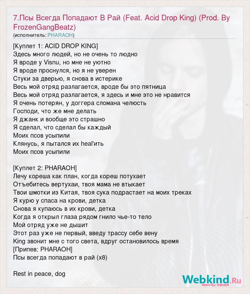 [Куплет 1: ACID DROP KING] Здесь много людей, но не очень то людно Я вроде у Visnu, но мне не уютно Я вроде проснулся, но я не уверен Стуки за дверью, я снова в истерике Весь мой отряд разлагается, вроде бы это пятница Весь мой отряд разлагается, я здесь и мне это не нравится Я очень потерян, у доггера сломана челюсть Господи, что же мне делать Я джанк и вообще это страшно Я сделал, что сделал бы каждый Моих псов усыпили Клянусь, я пытался их heal'ить Моих псов усыпили [Куплет 2: PHARAOH] Лечу кореша как план, когда кореш потухает Отъебитесь вертухаи, твоя мама не втыкает Твои шмотки из Китая, твоя сука подрастает на моих треках Я курю у спаса на крови, детка Снова я купаюсь в их крови, детка Когда я открыл глаза рядом гнило чье-то тело Мой отряд уже не дышит Этот раз уже не первый, введу трассу себе вену King звонит мне с того света, вдруг остановилось время [Припев: PHARAOH] Псы всегда попадают в рай (x8) Rest in peace, dog