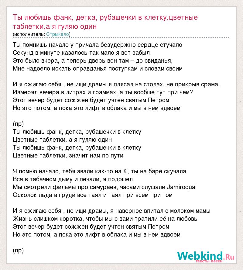 Ты помнишь начало у причала безудержно сердце стучало Секунд в минуте казалось так мало я вот забыл Это было вчера, а теперь дверь вон там – до свиданья, Мне надоело искать оправданья поступкам и словам своим И я сжигаю себя , не ищи драмы я плясал на столах, не прикрыв срама, Измерял вечера в литрах и граммах, а ты вообще тут при чем? Этот вечер будет сожжен будет учтен святым Петром Но это потом, а пока это лифт в облака и мы в нем вдвоем (пр) Ты любишь фанк, детка, рубашечки в клетку Цветные таблетки, а я гуляю один Ты любишь фанк, детка, рубашечки в клетку Цветные таблетки, значит нам по пути Я помню начало, тебя звали как-то на К, ты на баре скучала Вся в табачном дыму и печали, я подошел Мы смотрели фильмы про самураев, часами слушали Jamiroquai Осколок льда в груди все таял и таял при всем при том И я сжигаю себя , не ищи драмы, я наверное впитал с молоком мамы Жизнь слишком коротка, чтобы мы с вами тратили её на любовь Этот вечер будет сожжен будет учтен святым Петром Но это потом, а пока это лифт в облака и мы в нем вдвоем (пр)