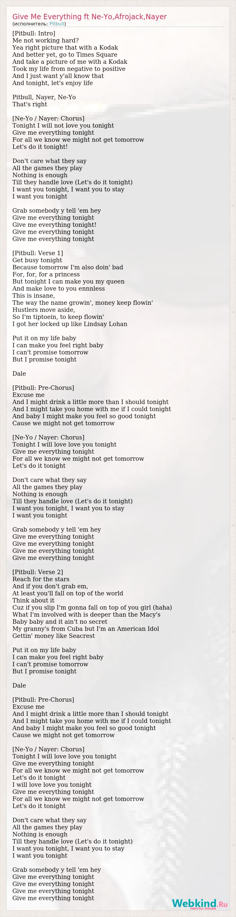 [Pitbull: Intro] Me not working hard? Yea right picture that with a Kodak And better yet, go to Times Square And take a picture of me with a Kodak Took my life from negative to positive And I just want y'all know that And tonight, let's enjoy life Pitbull, Nayer, Ne-Yo That's right [Ne-Yo / Nayer: Chorus] Tonight I will not love you tonight Give me everything tonight For all we know we might not get tomorrow Let's do it tonight! Don't care what they say All the games they play Nothing is enough Till they handle love (Let's do it tonight) I want you tonight, I want you to stay I want you tonight Grab somebody y tell 'em hey Give me everything tonight Give me everything tonight! Give me everything tonight Give me everything tonight [Pitbull: Verse 1] Get busy tonight Because tomorrow I'm also doin' bad For, for, for a princess But tonight I can make you my queen And make love to you ennnless This is insane, The way the name growin', money keep flowin' Hustlers move aside, So I'm tiptoein, to keep flowin' I got her locked up like Lindsay Lohan Put it on my life baby I can make you feel right baby I can't promise tomorrow But I promise tonight Dale [Pitbull: Pre-Chorus] Excuse me And I might drink a little more than I should tonight And I might take you home with me if I could tonight And baby I might make you feel so good tonight Cause we might not get tomorrow [Ne-Yo / Nayer: Chorus] Tonight I will love love you tonight Give me everything tonight For all we know we might not get tomorrow Let's do it tonight Don't care what they say All the games they play Nothing is enough Till they handle love (Let's do it tonight) I want you tonight, I want you to stay I want you tonight Grab somebody y tell 'em hey Give me everything tonight Give me everything tonight Give me everything tonight Give me everything tonight [Pitbull: Verse 2] Reach for the stars And if you don't grab em, At least you'll fall on top of the world Think about it Cuz if you slip I'm gonna fall on top of you girl (haha) What I'm involved with is deeper than the Macy's Baby baby and it ain't no secret My granny's from Cuba but I'm an American Idol Gettin' money like Seacrest Put it on my life baby I can make you feel right baby I can't promise tomorrow But I promise tonight Dale [Pitbull: Pre-Chorus] Excuse me And I might drink a little more than I should tonight And I might take you home with me if I could tonight And baby I might make you feel so good tonight Cause we might not get tomorrow [Ne-Yo / Nayer: Chorus] Tonight I will love love you tonight Give me everything tonight For all we know we might not get tomorrow Let's do it tonight I will love love you tonight Give me everything tonight For all we know we might not get tomorrow Let's do it tonight Don't care what they say All the games they play Nothing is enough Till they handle love (Let's do it tonight) I want you tonight, I want you to stay I want you tonight Grab somebody y tell 'em hey Give me everything tonight Give me everything tonight Give me everything tonight Give me everything tonight