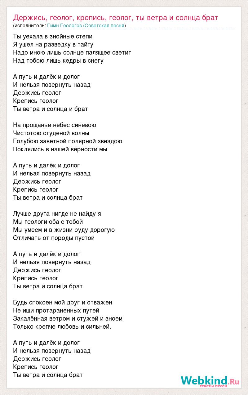 Ты уехала в знойные степи Я ушел на разведку в тайгу Надо мною лишь солнце палящее светит Над тобою лишь кедры в снегу А путь и далёк и долог И нельзя повернуть назад Держись геолог Крепись геолог Ты ветра и солнца и брат На прощанье небес синевою Чистотою студеной волны Голубою заветной полярной звездою Поклялись в нашей верности мы А путь и далёк и долог И нельзя повернуть назад Держись геолог Крепись геолог Ты ветра и солнца брат Лучше друга нигде не найду я Мы геологи оба с тобой Мы умеем и в жизни руду дорогую Отличать от породы пустой А путь и далёк и долог И нельзя повернуть назад Держись геолог Крепись геолог Ты ветра и солнца брат Будь спокоен мой друг и отважен Не ищи протараненных путей Закалённая ветром и стужей и зноем Только крепче любовь и сильней. А путь и далёк и долог И нельзя повернуть назад Держись геолог Крепись геолог Ты ветра и солнца брат