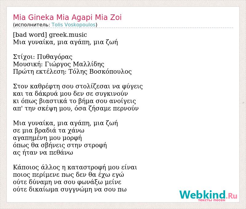 А как ты думаешь, о чем песня "Mia Gineka Mia Agapi Mia Zoi" ?