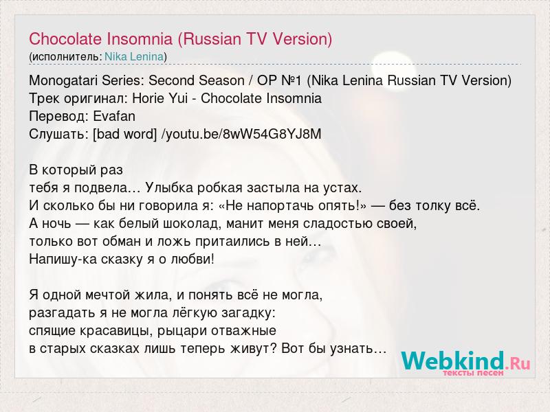 Monogatari Series: Second Season / OP №1 (Nika Lenina Russian TV Version) Трек оригинал: Horie Yui - Chocolate Insomnia Перевод: Evafan Слушать: [bad word] /youtu.be/8wW54G8YJ8M В который раз тебя я подвела… Улыбка робкая застыла на устах. И сколько бы ни говорила я: «Не напортачь опять!» — без толку всё. А ночь — как белый шоколад, манит меня сладостью своей, только вот обман и ложь притаились в ней… Напишу-ка сказку я о любви! Я одной мечтой жила, и понять всё не могла, разгадать я не могла лёгкую загадку: спящие красавицы, рыцари отважные в старых сказках лишь теперь живут? Вот бы узнать…