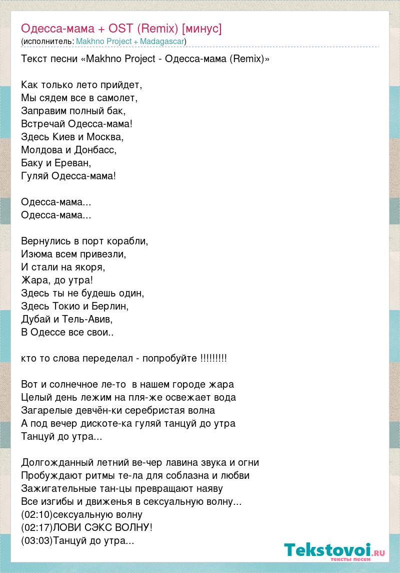 Текст песни «Makhno Project - Одесса-мама (Remix)» Как только лето прийдет, Мы сядем все в самолет, Заправим полный бак, Встречай Одесса-мама! Здесь Киев и Москва, Молдова и Донбасс, Баку и Ереван, Гуляй Одесса-мама! Одесса-мама... Одесса-мама... Вернулись в порт корабли, Изюма всем привезли, И стали на якоря, Жара, до утра! Здесь ты не будешь один, Здесь Токио и Берлин, Дубай и Тель-Авив, В Одессе все свои.. кто то слова переделал - попробуйте !!!!!!!!! Вот и солнечное ле-то в нашем городе жара Целый день лежим на пля-же освежает вода Загарелые девчён-ки серебристая волна А под вечер дискоте-ка гуляй танцуй до утра Танцуй до утра... Долгожданный летний ве-чер лавина звука и огни Пробуждают ритмы те-ла для соблазна и любви Зажигательные тан-цы превращают наяву Все изгибы и движенья в сексуальную волну... (02:10)сексуальную волну (02:17)ЛОВИ СЭКС ВОЛНУ! (03:03)Танцуй до утра...