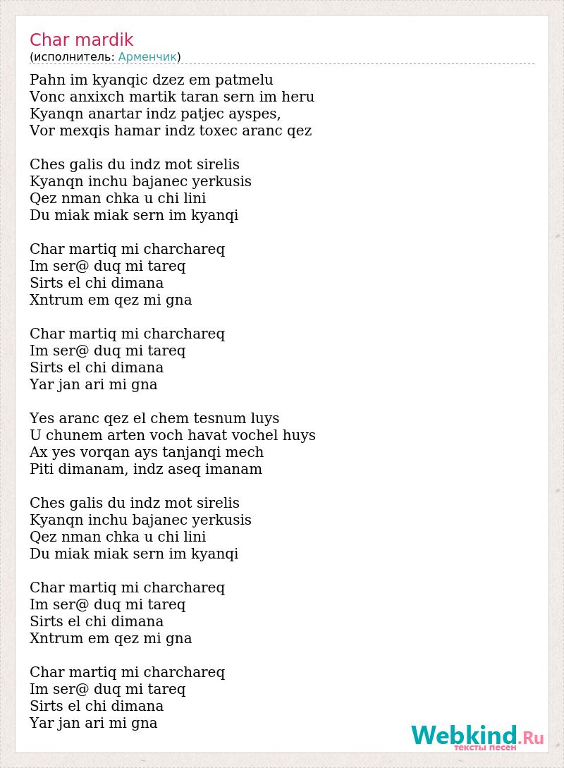 Pahn im kyanqic dzez em patmelu Vonc anxixch martik taran sern im heru Kyanqn anartar indz patjec ayspes, Vor mexqis hamar indz toxec aranc qez Ches galis du indz mot sirelis Kyanqn inchu bajanec yerkusis Qez nman chka u chi lini Du miak miak sern im kyanqi Char martiq mi charchareq Im ser@ duq mi tareq Sirts el chi dimana Xntrum em qez mi gna Char martiq mi charchareq Im ser@ duq mi tareq Sirts el chi dimana Yar jan ari mi gna Yes aranc qez el chem tesnum luys U chunem arten voch havat vochel huys Ax yes vorqan ays tanjanqi mech Piti dimanam, indz aseq imanam Ches galis du indz mot sirelis Kyanqn inchu bajanec yerkusis Qez nman chka u chi lini Du miak miak sern im kyanqi Char martiq mi charchareq Im ser@ duq mi tareq Sirts el chi dimana Xntrum em qez mi gna Char martiq mi charchareq Im ser@ duq mi tareq Sirts el chi dimana Yar jan ari mi gna