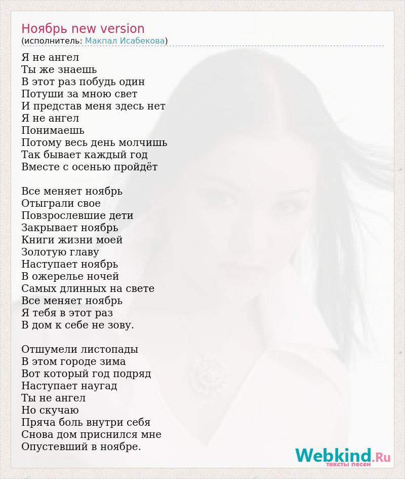 Я не ангел Ты же знаешь В этот раз побудь один Потуши за мною свет И представ меня здесь нет Я не ангел Понимаешь Потому весь день молчишь Так бывает каждый год Вместе с осенью пройдёт Все меняет ноябрь Отыграли свое Повзрослевшие дети Закрывает ноябрь Книги жизни моей Золотую главу Наступает ноябрь В ожерелье ночей Самых длинных на свете Все меняет ноябрь Я тебя в этот раз В дом к себе не зову. Отшумели листопады В этом городе зима Вот который год подряд Наступает наугад Ты не ангел Но скучаю Пряча боль внутри себя Снова дом приснился мне Опустевший в ноябре.