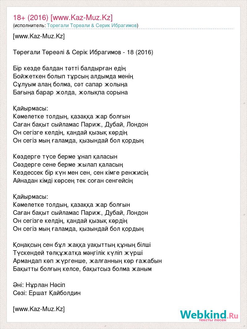 [www.Kaz-Muz.Kz] Төреғали Төреәлі & Серік Ибрагимов - 18 (2016) Бір кезде балдан тәтті балдырған едің Бойжеткен болып тұрсың алдымда менің Сұлуым алаң болма, сәт сапар жолыңа Бағыңа барар жолда, жолықпа сорына Қайырмасы: Кәмелетке толдың, қазаққа жар болғын Саған бақыт сыйламас Париж, Дубай, Лондон Он сегізге келдің, қандай қызық көрдің Он сегіз мың ғаламда, қызындай бол қордың Көздерге түсе берме ұнап қаласын Сөздерге сене берме жылап қаласың Кездессек бір күн мен сен, сен кімге ренжисің Айнадан кімді көрсең тек соған сенгейсің Қайырмасы: Кәмелетке толдың, қазаққа жар болғын Саған бақыт сыйламас Париж, Дубай, Лондон Он сегізге келдің, қандай қызық көрдің Он сегіз мың ғаламда, қызындай бол қордың Қоңақсың сен бұл жаққа уақыттың құның білші Түскендей төлқұжатқа мәңгілік күліп жүрші Армандап көп жүргенше, жалғанның көр ғажабын Бақытты болғың келсе, бақытсыз болма жаным Әні: Нұрлан Нәсіп Сөзі: Ершат Қайболдин [www.Kaz-Muz.Kz]