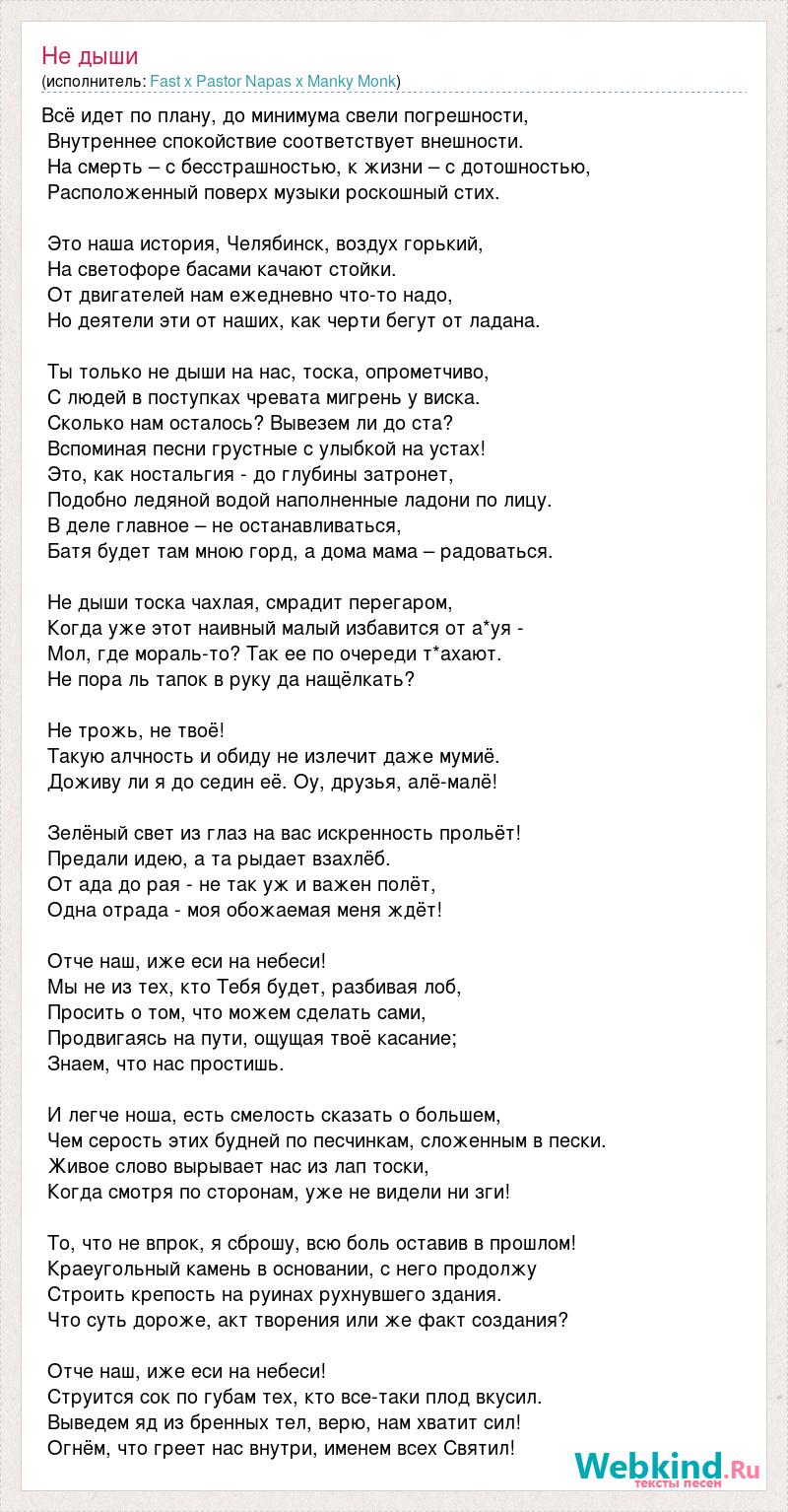 Всё идет по плану, до минимума свели погрешности, Внутреннее спокойствие соответствует внешности. На смерть – с бесстрашностью, к жизни – с дотошностью, Расположенный поверх музыки роскошный стих. Это наша история, Челябинск, воздух горький, На светофоре басами качают стойки. От двигателей нам ежедневно что-то надо, Но деятели эти от наших, как черти бегут от ладана. Ты только не дыши на нас, тоска, опрометчиво, С людей в поступках чревата мигрень у виска. Сколько нам осталось? Вывезем ли до ста? Вспоминая песни грустные с улыбкой на устах! Это, как ностальгия - до глубины затронет, Подобно ледяной водой наполненные ладони по лицу. В деле главное – не останавливаться, Батя будет там мною горд, а дома мама – радоваться. Не дыши тоска чахлая, смрадит перегаром, Когда уже этот наивный малый избавится от а*уя - Мол, где мораль-то? Так ее по очереди т*ахают. Не пора ль тапок в руку да нащёлкать? Не трожь, не твоё! Такую алчность и обиду не излечит даже мумиё. Доживу ли я до седин её. Оу, друзья, алё-малё! Зелёный свет из глаз на вас искренность прольёт! Предали идею, а та рыдает взахлёб. От ада до рая - не так уж и важен полёт, Одна отрада - моя обожаемая меня ждёт! Отче наш, иже еси на небеси! Мы не из тех, кто Тебя будет, разбивая лоб, Просить о том, что можем сделать сами, Продвигаясь на пути, ощущая твоё касание; Знаем, что нас простишь. И легче ноша, есть смелость сказать о большем, Чем серость этих будней по песчинкам, сложенным в пески. Живое слово вырывает нас из лап тоски, Когда смотря по сторонам, уже не видели ни зги! То, что не впрок, я сброшу, всю боль оставив в прошлом! Краеугольный камень в основании, с него продолжу Строить крепость на руинах рухнувшего здания. Что суть дороже, акт творения или же факт создания? Отче наш, иже еси на небеси! Струится сок по губам тех, кто все-таки плод вкусил. Выведем яд из бренных тел, верю, нам хватит сил! Огнём, что греет нас внутри, именем всех Святил!