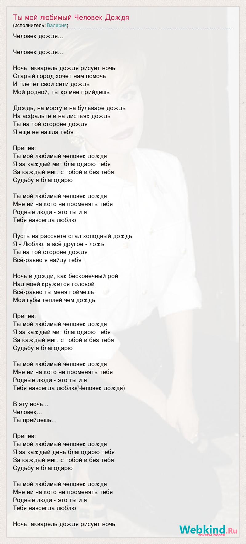 Человек дождя... Человек дождя... Ночь, акварель дождя рисует ночь Старый город хочет нам помочь И плетет свои сети дождь Мой родной, ты ко мне прийдешь Дождь, на мосту и на бульваре дождь На асфальте и на листьях дождь Ты на той стороне дождя Я еще не нашла тебя Припев: Ты мой любимый человек дождя Я за каждый миг благодарю тебя За каждый миг, с тобой и без тебя Судьбу я благодарю Ты мой любимый человек дождя Мне ни на кого не променять тебя Родные люди - это ты и я Тебя навсегда люблю Пусть на рассвете стал холодный дождь Я - Люблю, а всё другое - ложь Ты на той стороне дождя Всё-равно я найду тебя Ночь и дожди, как бесконечный рой Над моей кружится головой Всё-равно ты меня поймешь Мои губы теплей чем дождь Припев: Ты мой любимый человек дождя Я за каждый миг благодарю тебя За каждый миг, с тобой и без тебя Судьбу я благодарю Ты мой любимый человек дождя Мне ни на кого не променять тебя Родные люди - это ты и я Тебя навсегда люблю(Человек дождя) В эту ночь... Человек... Ты прийдешь... Припев: Ты мой любимый человек дождя Я за каждый день благодарю тебя За каждый миг, с тобой и без тебя Судьбу я благодарю Ты мой любимый человек дождя Мне ни на кого не променять тебя Родные люди - это ты и я Тебя навсегда люблю Ночь, акварель дождя рисует ночь