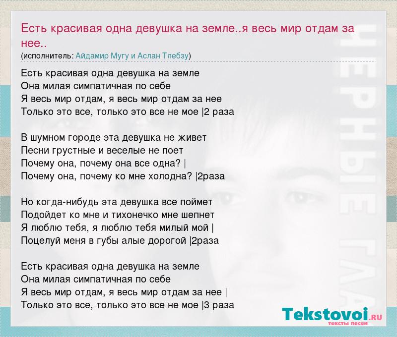 Есть красивая одна девушка на земле Она милая симпатичная по себе Я весь мир отдам, я весь мир отдам за нее Только это все, только это все не мое |2 раза В шумном городе эта девушка не живет Песни грустные и веселые не поет Почему она, почему она все одна? | Почему она, почему ко мне холодна? |2раза Но когда-нибудь эта девушка все поймет Подойдет ко мне и тихонечко мне шепнет Я люблю тебя, я люблю тебя милый мой | Поцелуй меня в губы алые дорогой |2раза Есть красивая одна девушка на земле Она милая симпатичная по себе Я весь мир отдам, я весь мир отдам за нее | Только это все, только это все не мое |3 раза